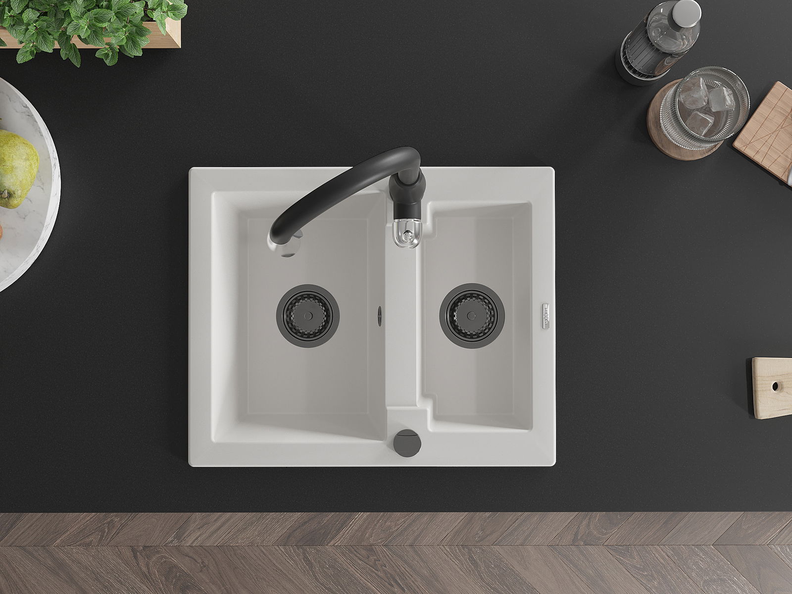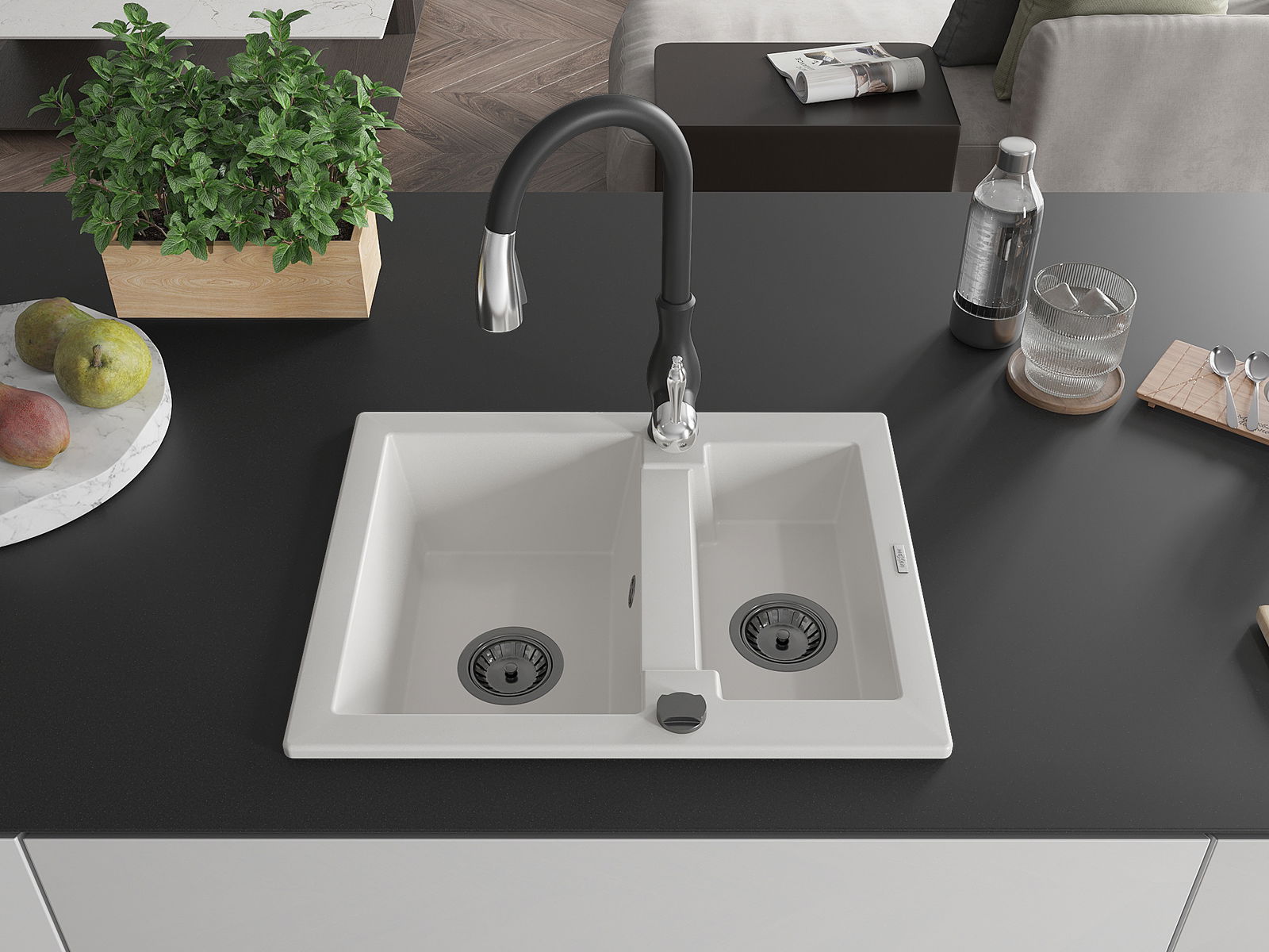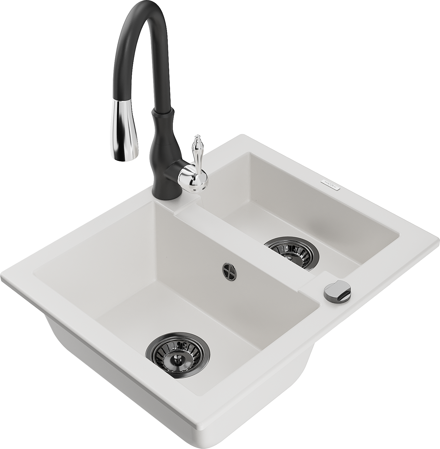 Mexen Carlos zlewozmywak granitowy 1,5-komorowy z baterią kuchenną Savita, biały - 6518-20-672601-70