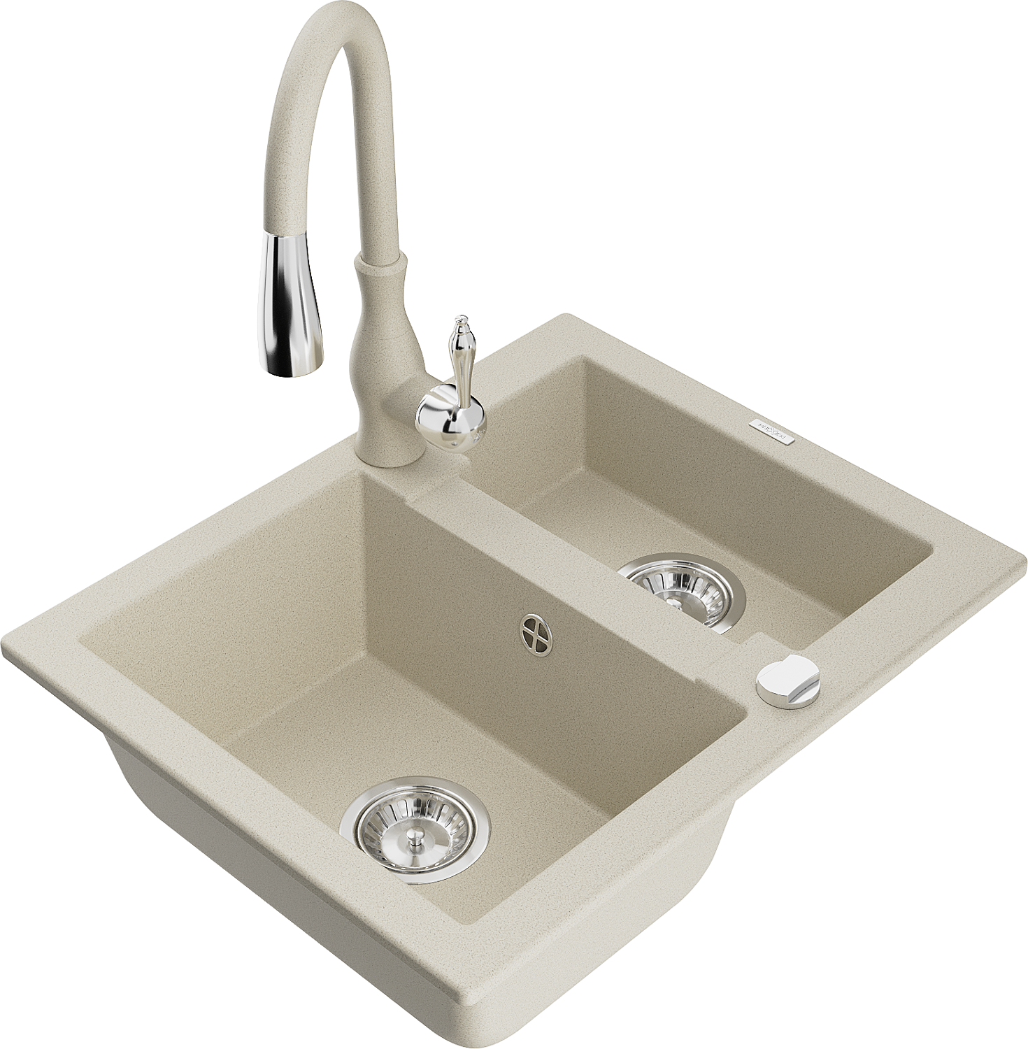 Mexen Carlos zlewozmywak granitowy 1,5-komorowy z baterią kuchenną Savita, beżowy - 6518-69-672601-69