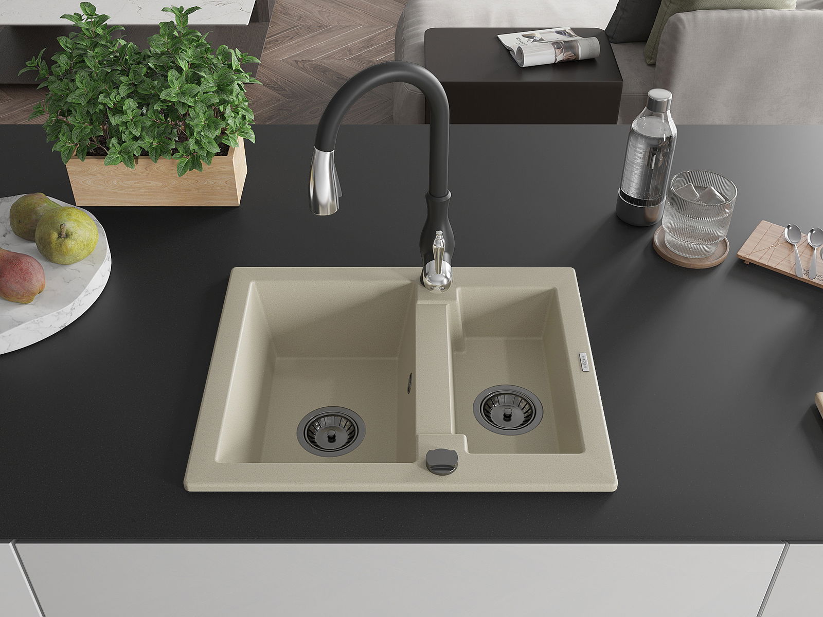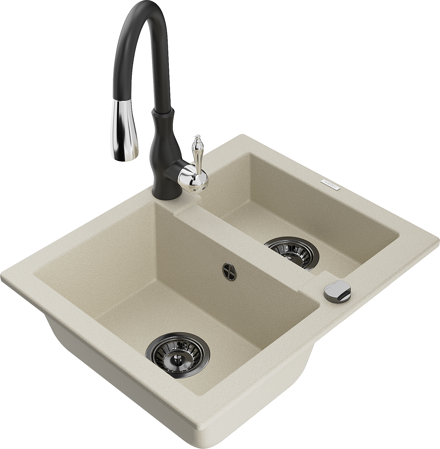 Mexen Carlos zlewozmywak granitowy 1,5-komorowy z baterią kuchenną Savita, beżowy - 6518-69-672601-70