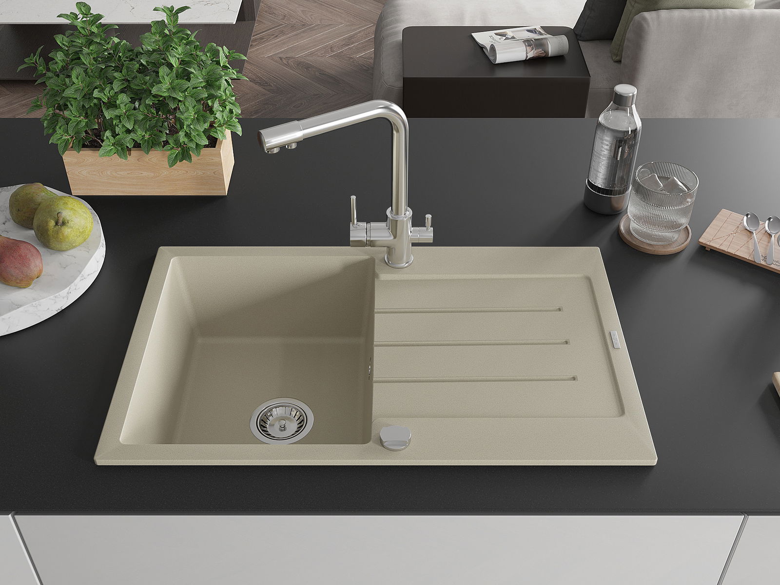 Zlewozmywak został wykonany z wysokiej jakości granitu. Stanowi eleganckie, a przede wszystkim praktyczne uzupełnienie każdej kuchni, niezależnie od jej stylu. Wysoka jakość oraz trwałość granitu zapewniają wieloletnie użytkowanie.