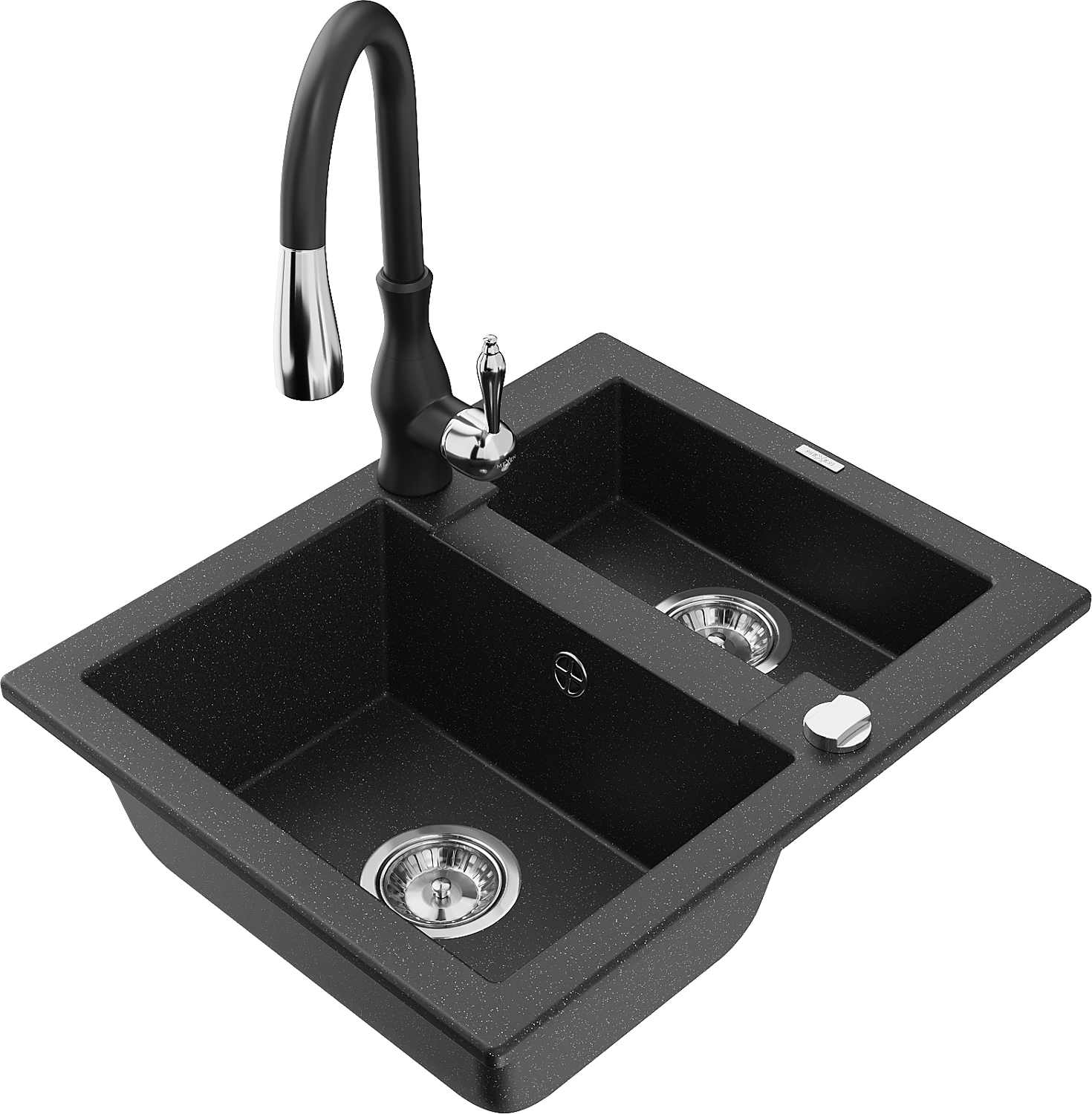 Mexen Carlos zlewozmywak granitowy 1,5-komorowy z baterią kuchenną Savita, czarny/srebrny metalik - 6518-73-672601-70