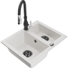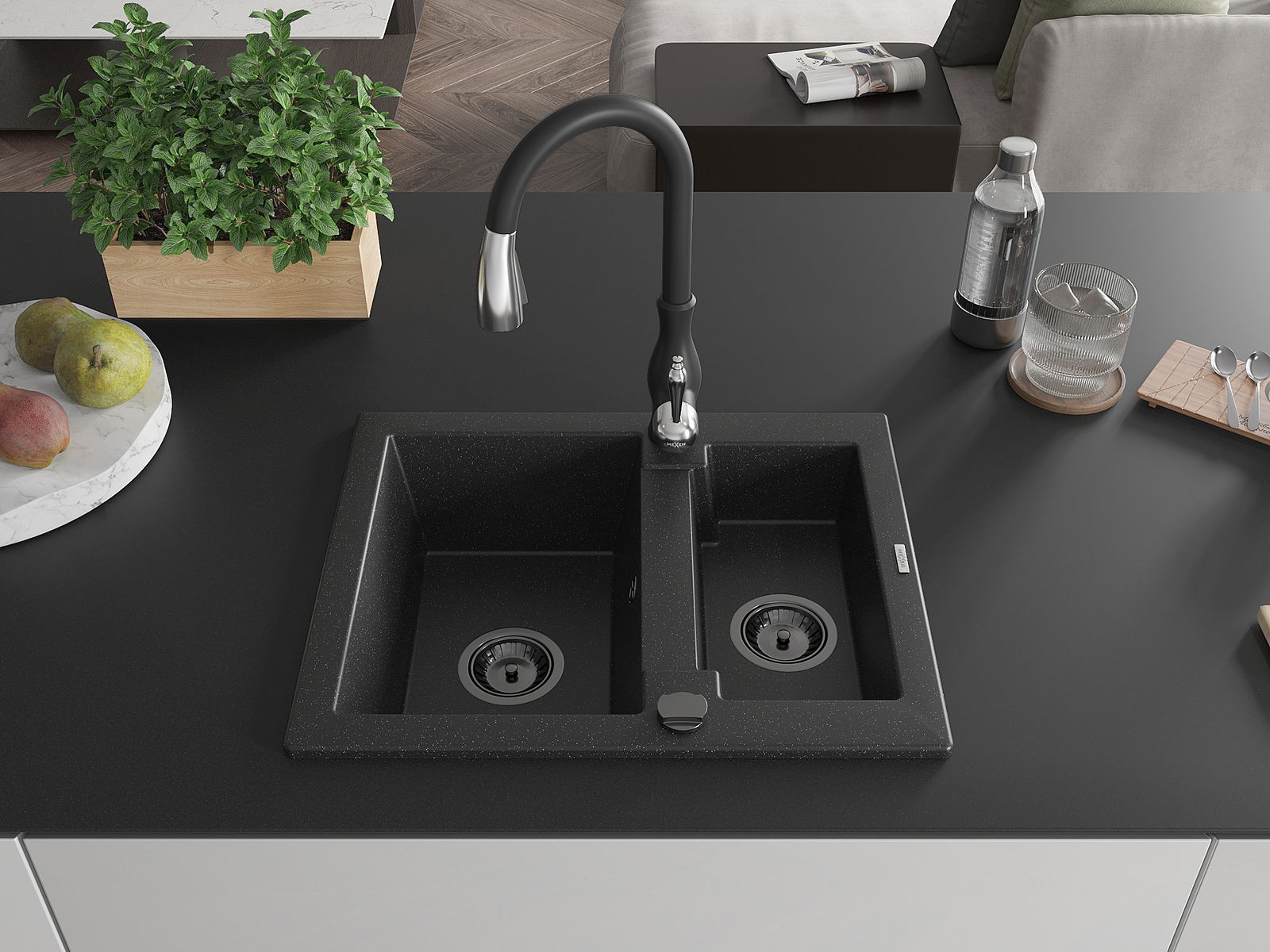 Mexen Carlos zlewozmywak granitowy 1,5-komorowy z baterią kuchenną Savita, czarny/srebrny metalik - 6518-73-672601-70-B