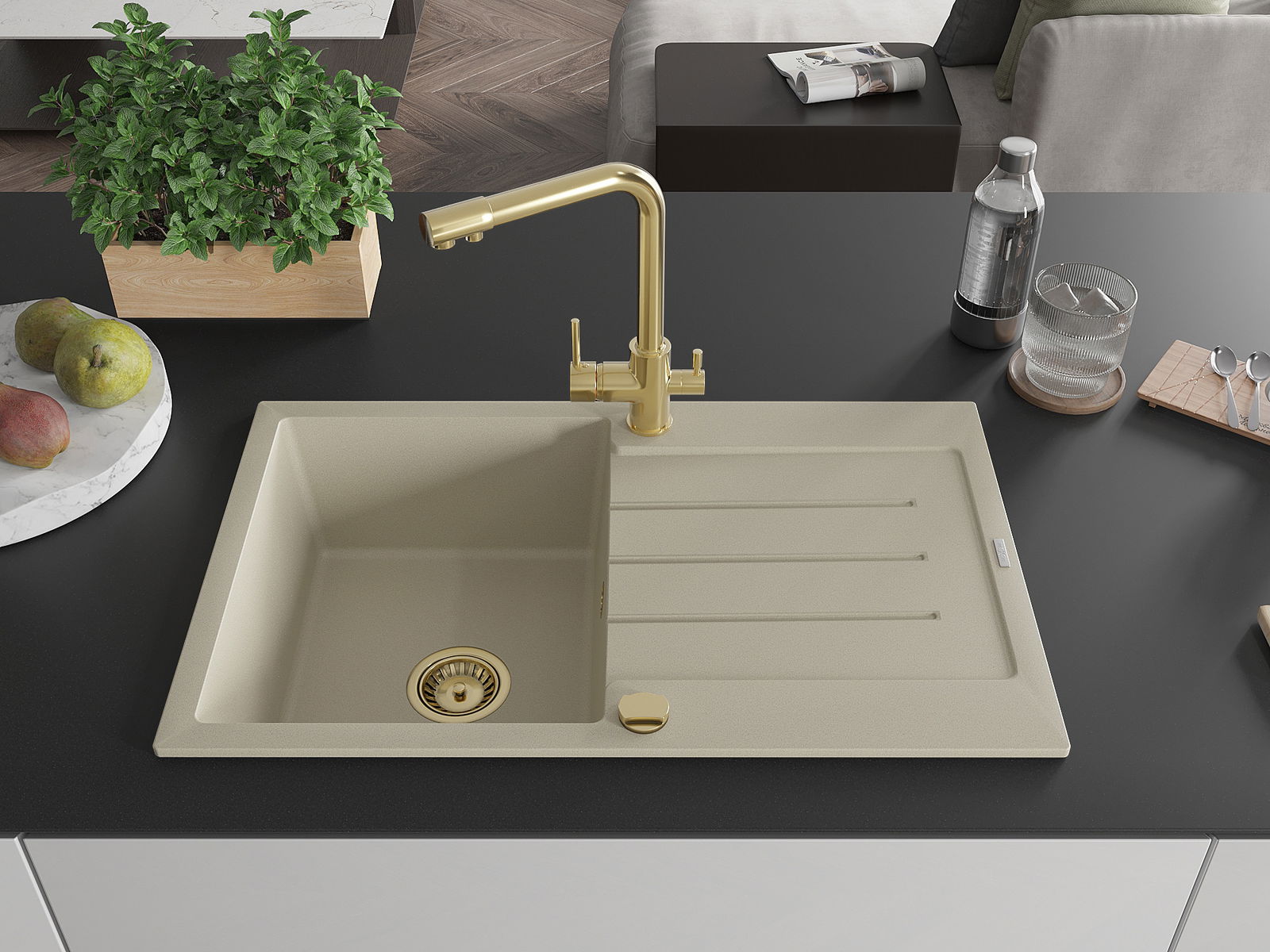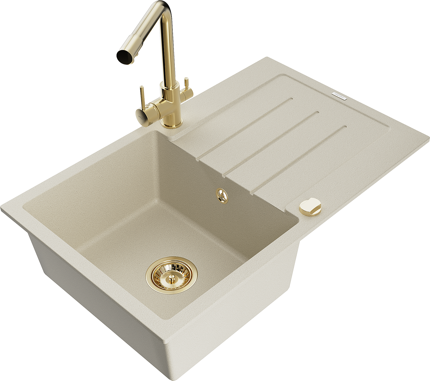 Mexen Bruno zlewozmywak granitowy 1-komorowy z ociekaczem i baterią kuchenną Duero, beżowy - 6513-69-671600-50