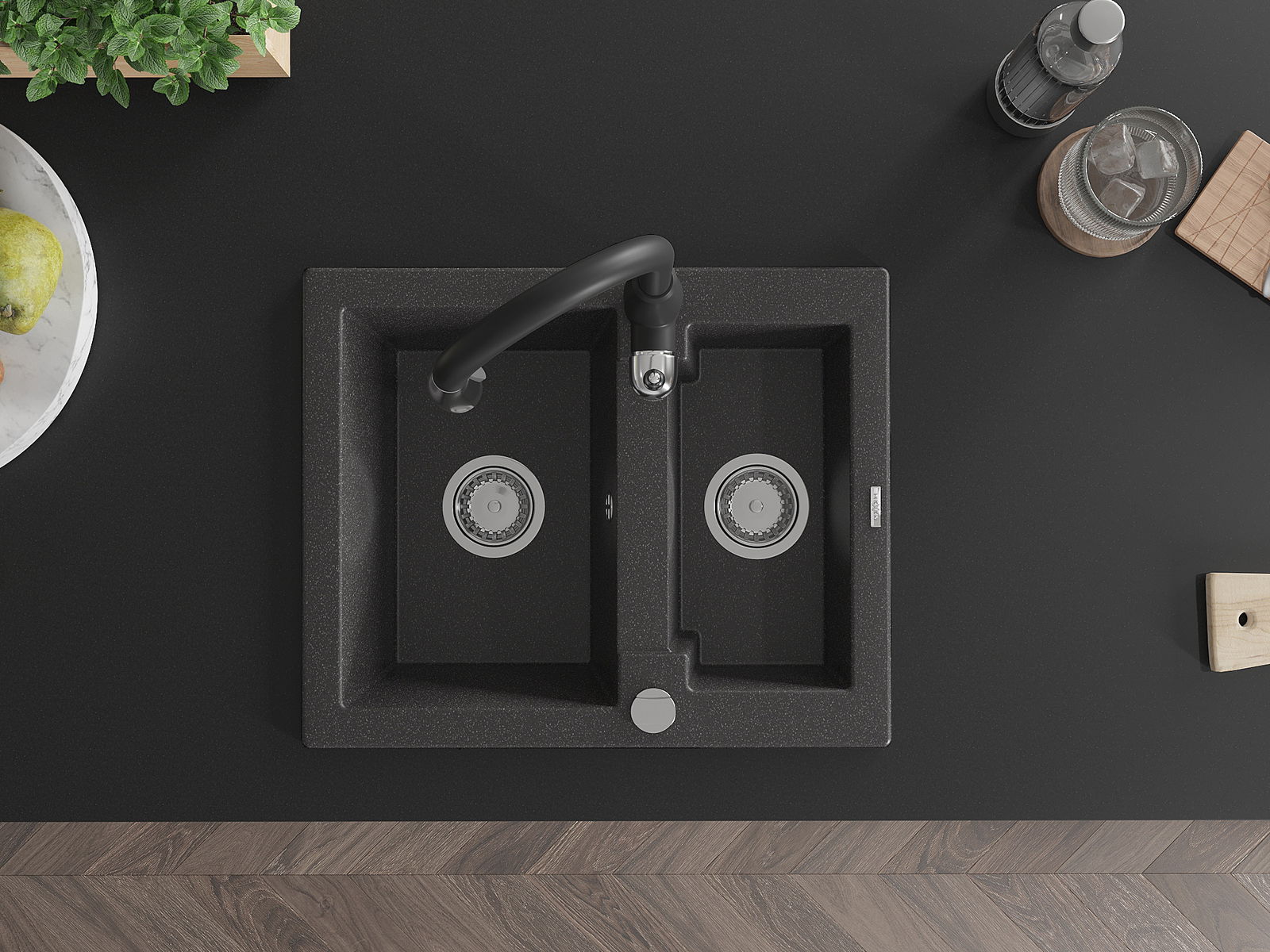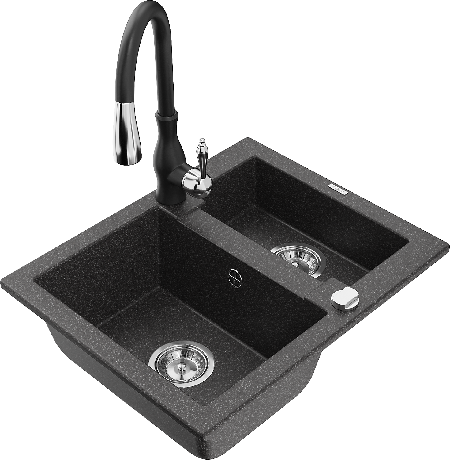 Mexen Carlos zlewozmywak granitowy 1,5-komorowy z baterią kuchenną Savita, czarny nakrapiany - 6518-76-672601-70