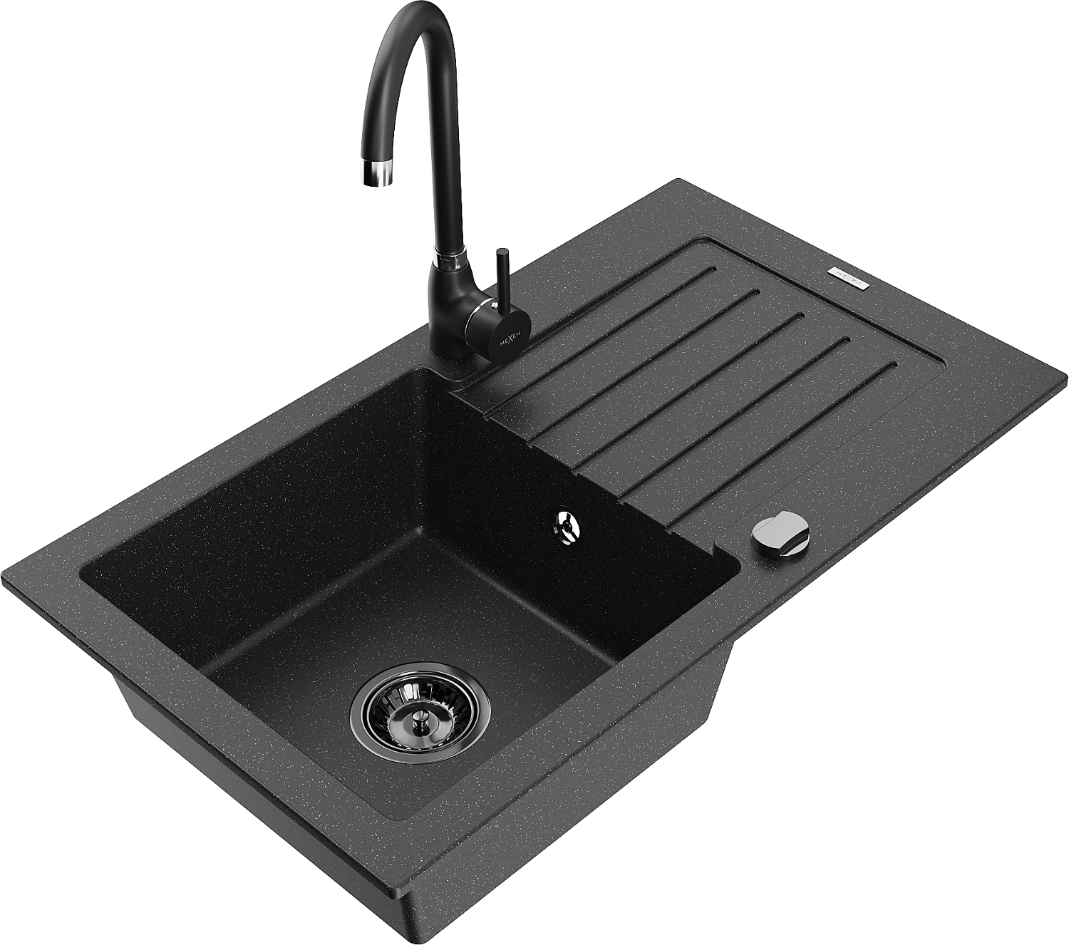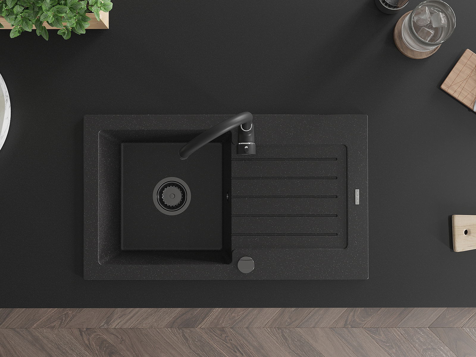 Mexen Pablo zlewozmywak granitowy 1-komorowy z ociekaczem i baterią kuchenną Telma, czarny/srebrny - 6510-73-670200-70-B