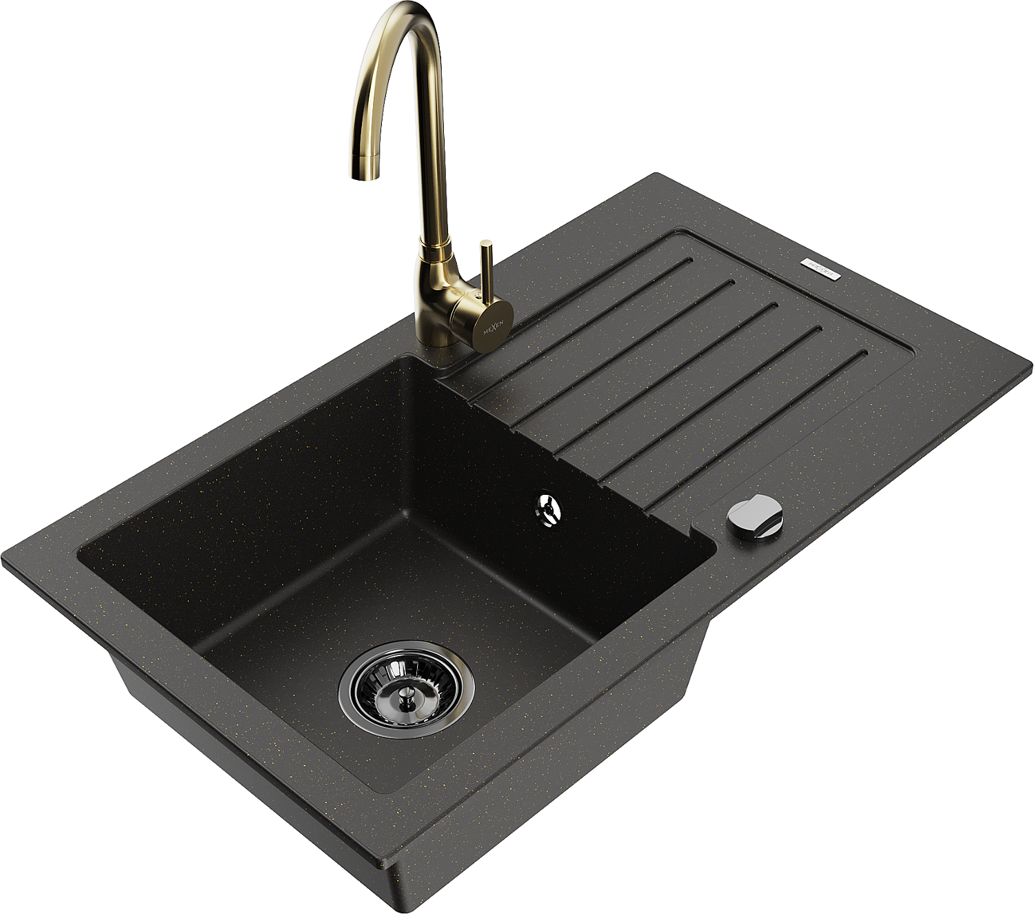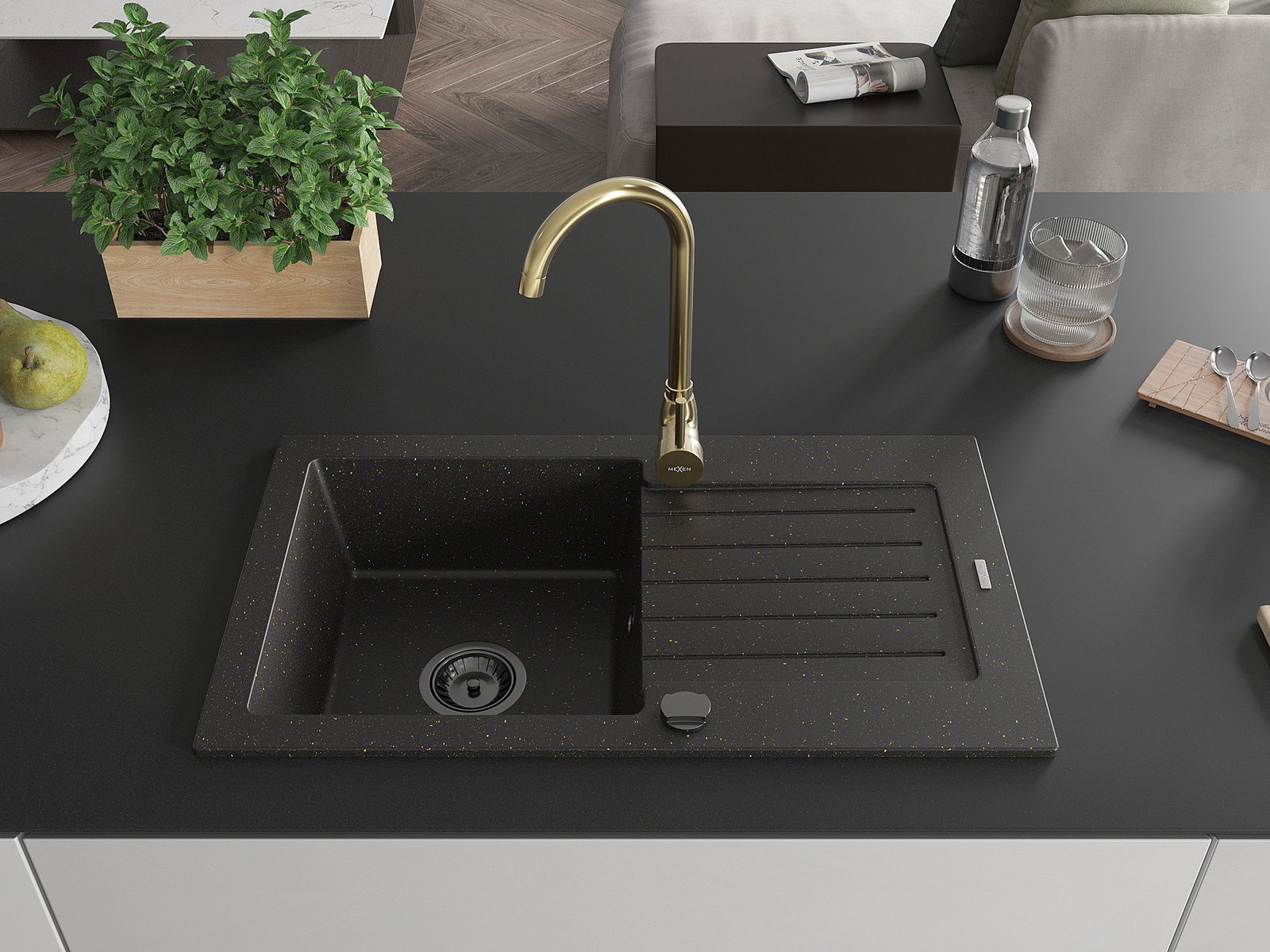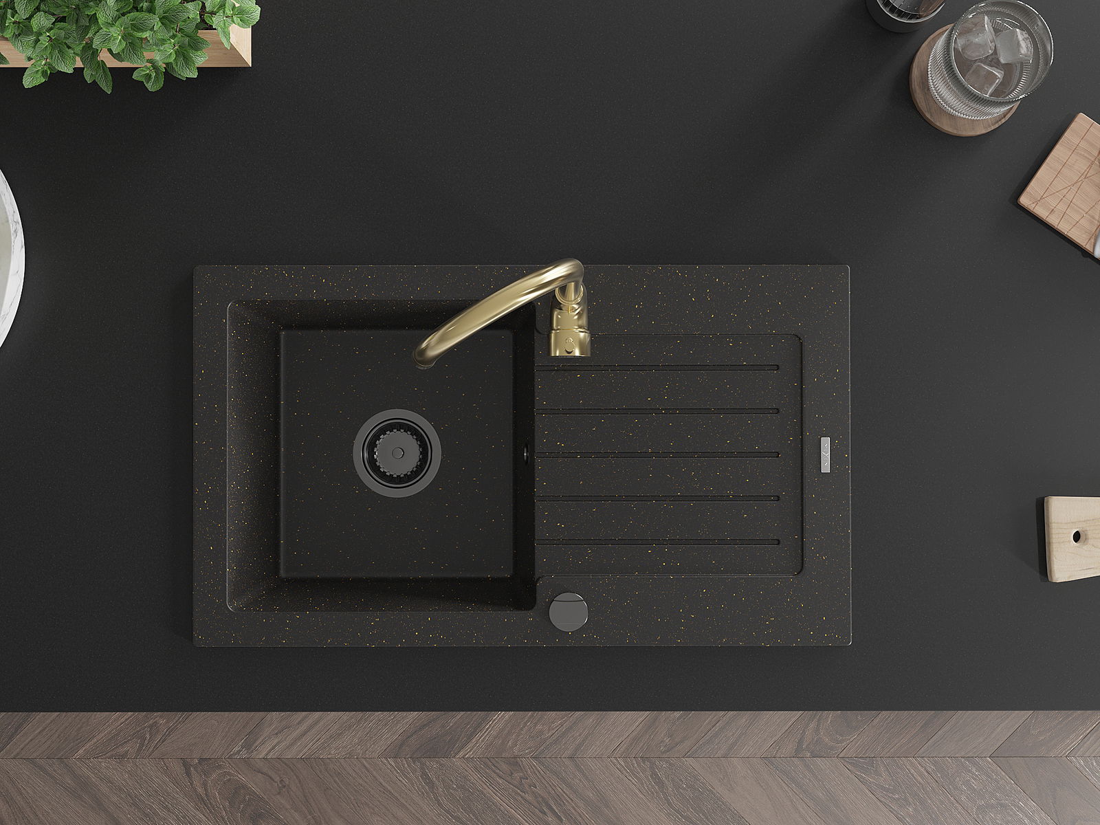 Mexen Pablo zlewozmywak granitowy 1-komorowy z ociekaczem i baterią kuchenną Telma, czarny/złoty - 6510-75-670200-50-B