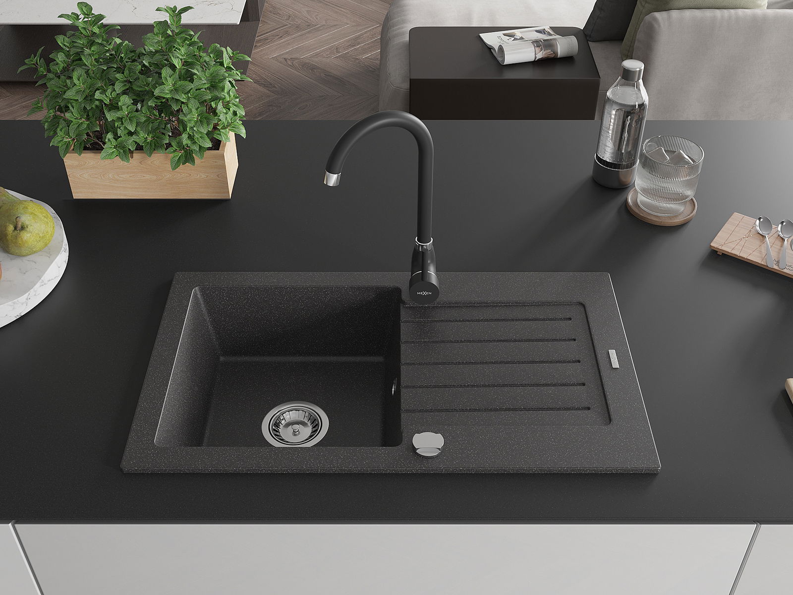 Mexen Pablo zlewozmywak granitowy 1-komorowy z ociekaczem i baterią kuchenną Telma, czarny nakrapiany - 6510-76-670200-70