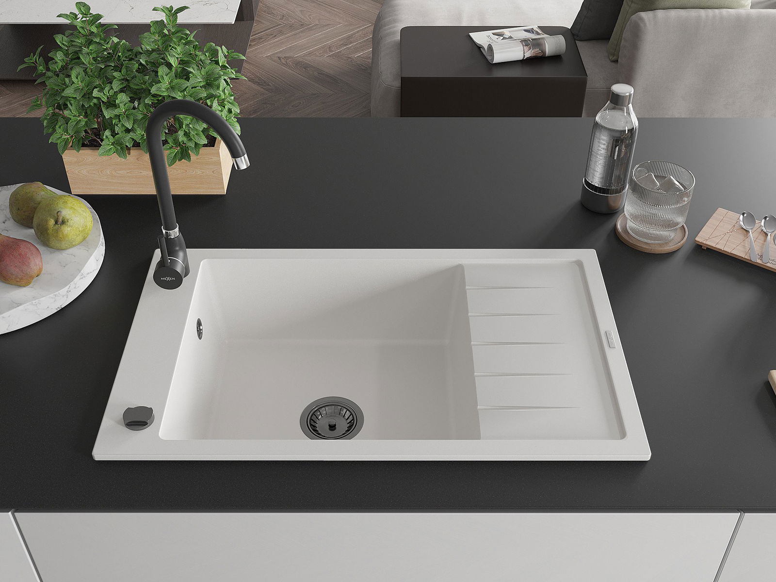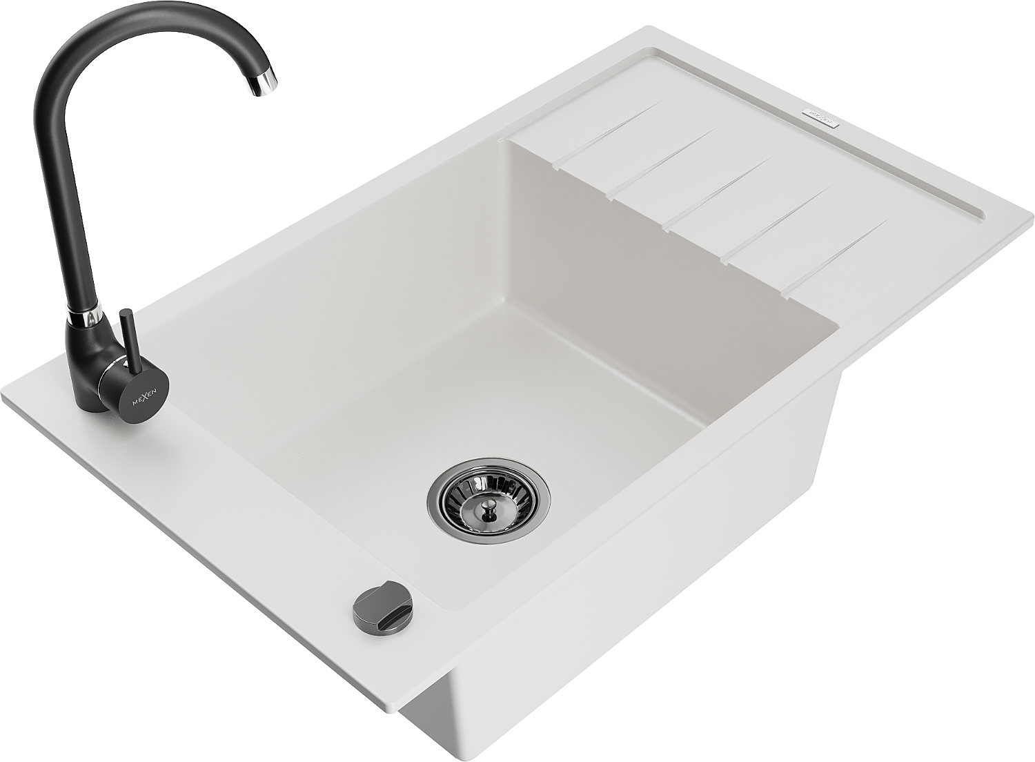 Mexen Elias zlewozmywak granitowy 1-komorowy z ociekaczem i baterią kuchenną Telma, biały - 6511-20-670200-70