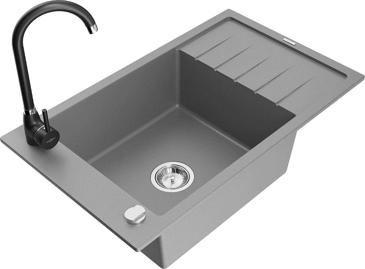 Mexen Elias zlewozmywak granitowy 1-komorowy z ociekaczem i baterią kuchenną Telma, szary - 6511-71-670200-70