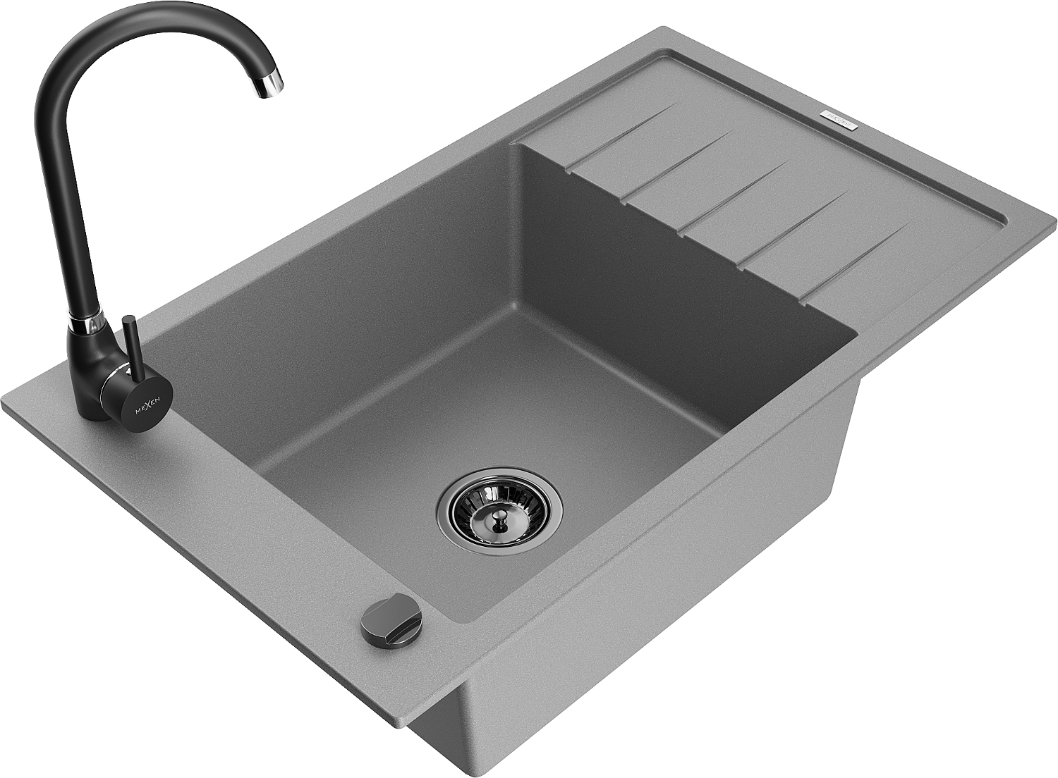 Mexen Elias zlewozmywak granitowy 1-komorowy z ociekaczem i baterią kuchenną Telma, szary - 6511-71-670200-70-B