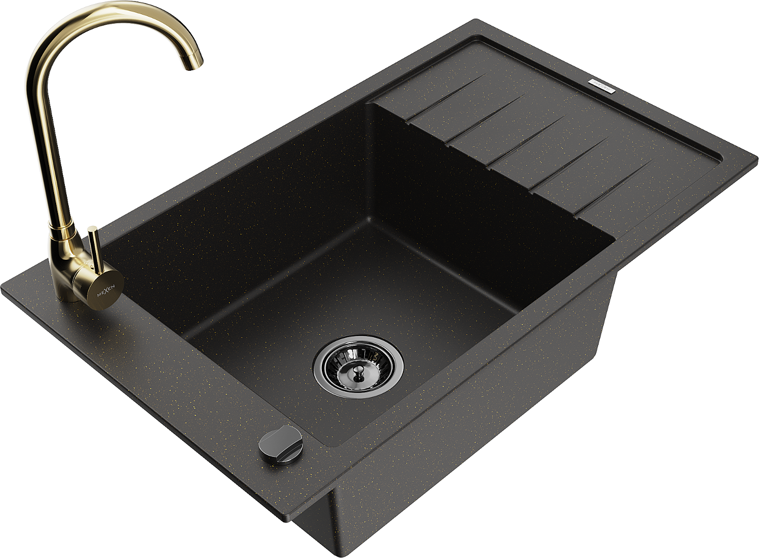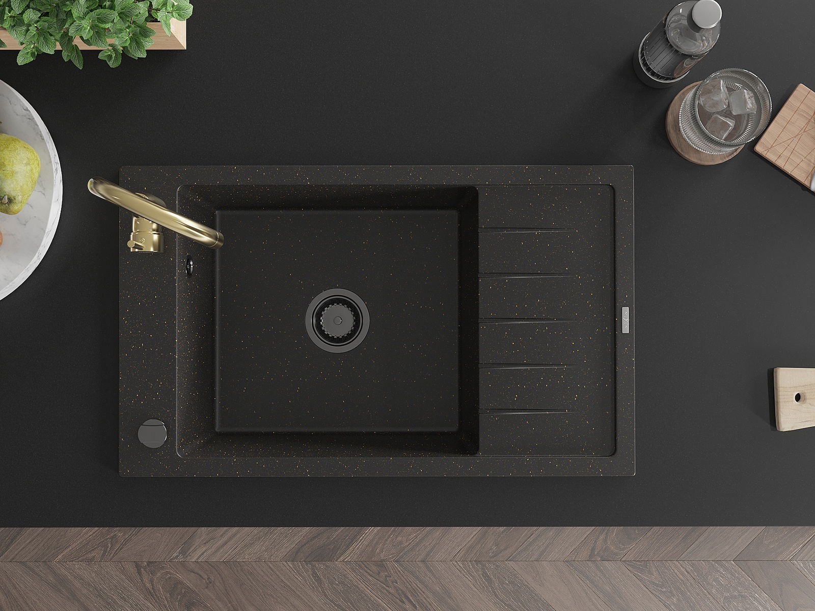 Mexen Elias zlewozmywak granitowy 1-komorowy z ociekaczem i baterią kuchenną Telma, czarny/złoty - 6511-75-670200-50-B