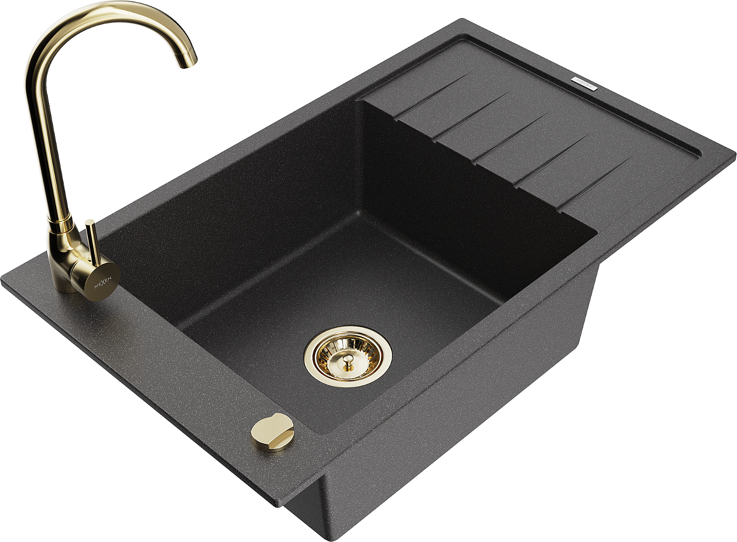 Mexen Elias zlewozmywak granitowy 1-komorowy z ociekaczem i baterią kuchenną Telma, czarny nakrapiany - 6511-76-670200-50