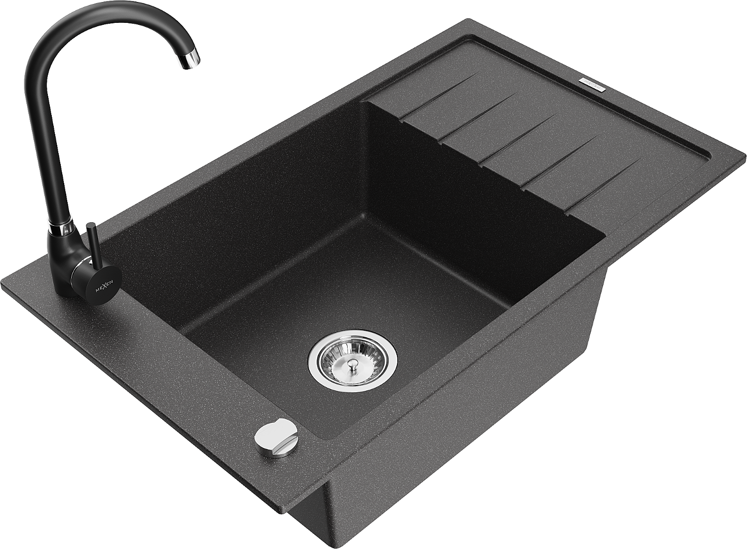 Mexen Elias zlewozmywak granitowy 1-komorowy z ociekaczem i baterią kuchenną Telma, czarny nakrapiany - 6511-76-670200-70