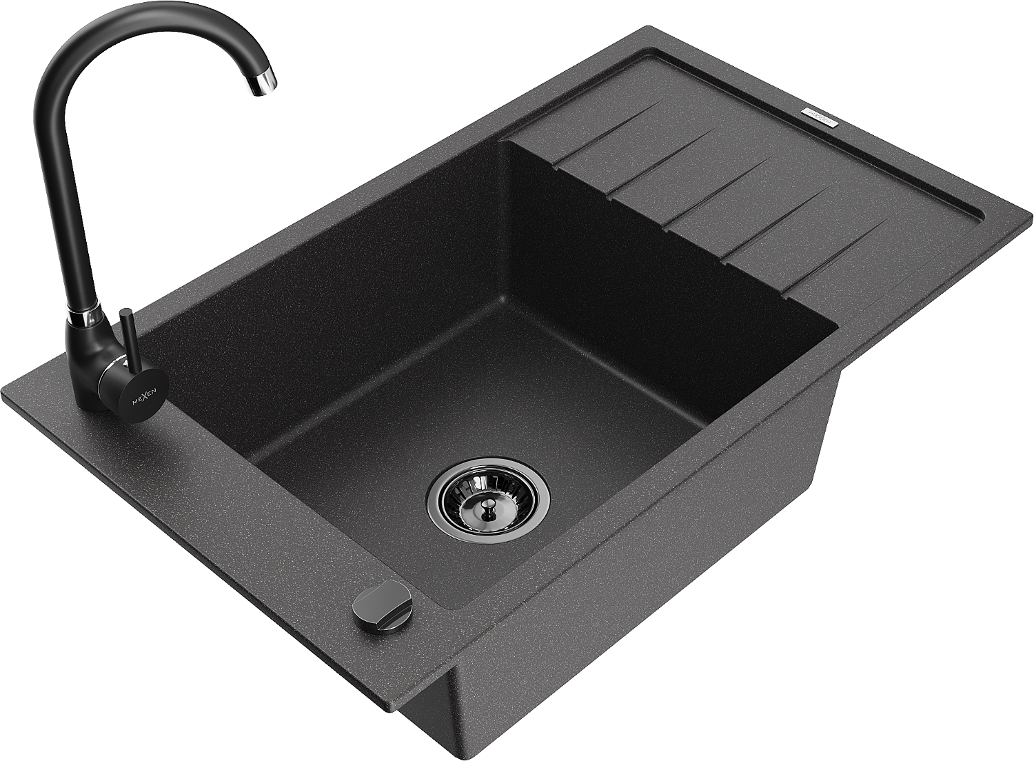 Mexen Elias zlewozmywak granitowy 1-komorowy z ociekaczem i baterią kuchenną Telma, czarny nakrapiany - 6511-76-670200-70-B