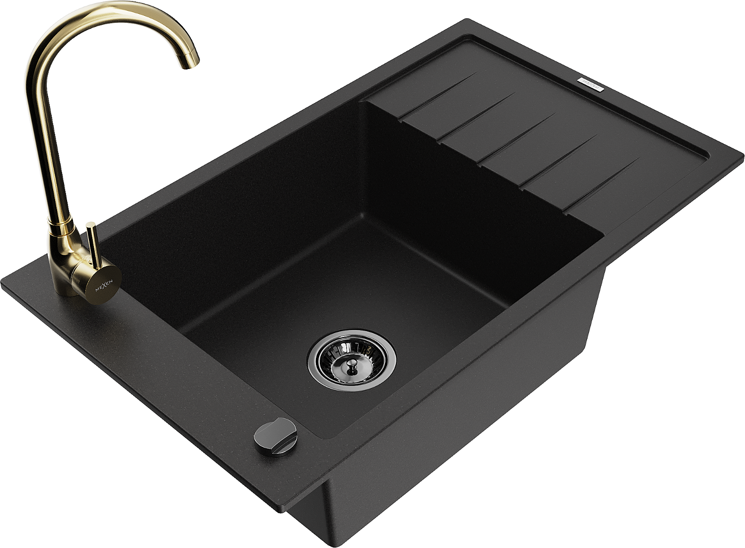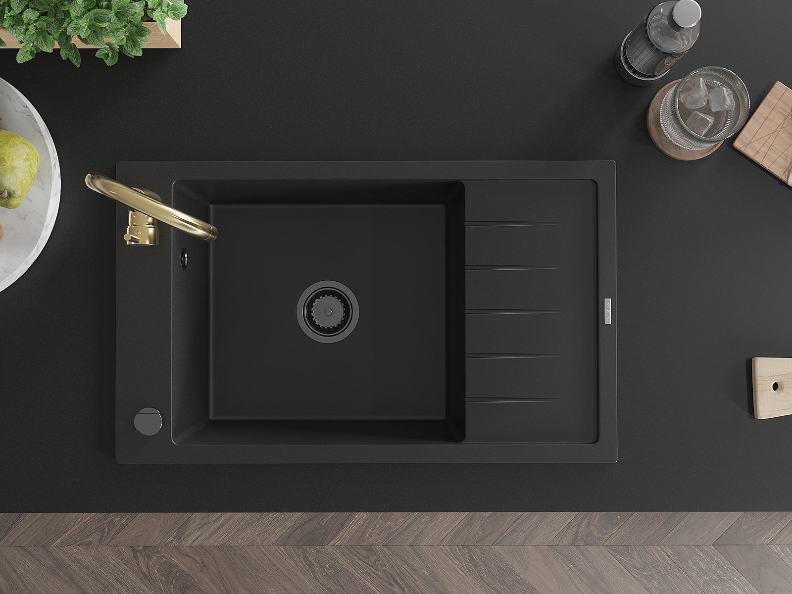 Mexen Elias zlewozmywak granitowy 1-komorowy z ociekaczem i baterią kuchenną Telma, czarny - 6511-77-670200-50-B