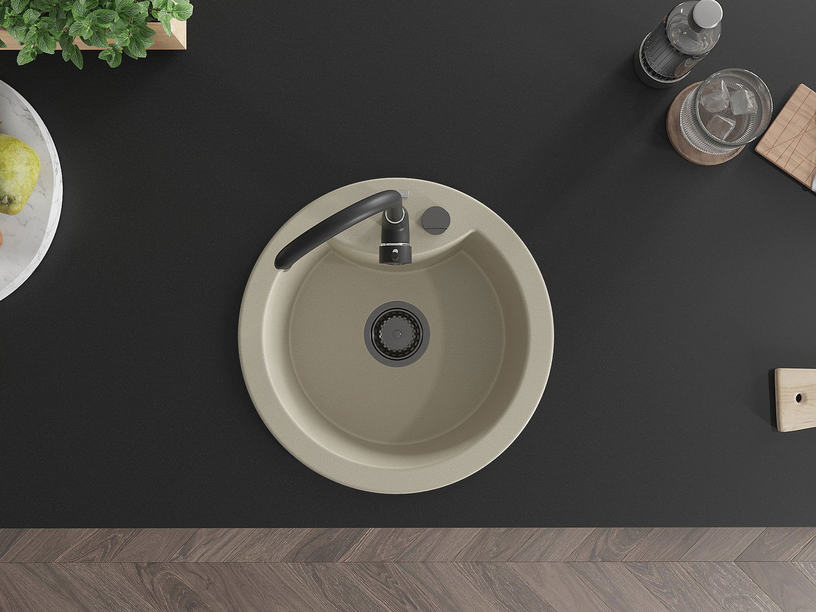 Zlew posiada podfrezowany otwór o średnicy 35 mm do samodzielnego wybicia. Można go wykorzystać m.in. do montażu dozownika na płyn, który wyeliminuje obecność plastikowych butelek w kuchni i nada jej eleganckiego wykończenia.