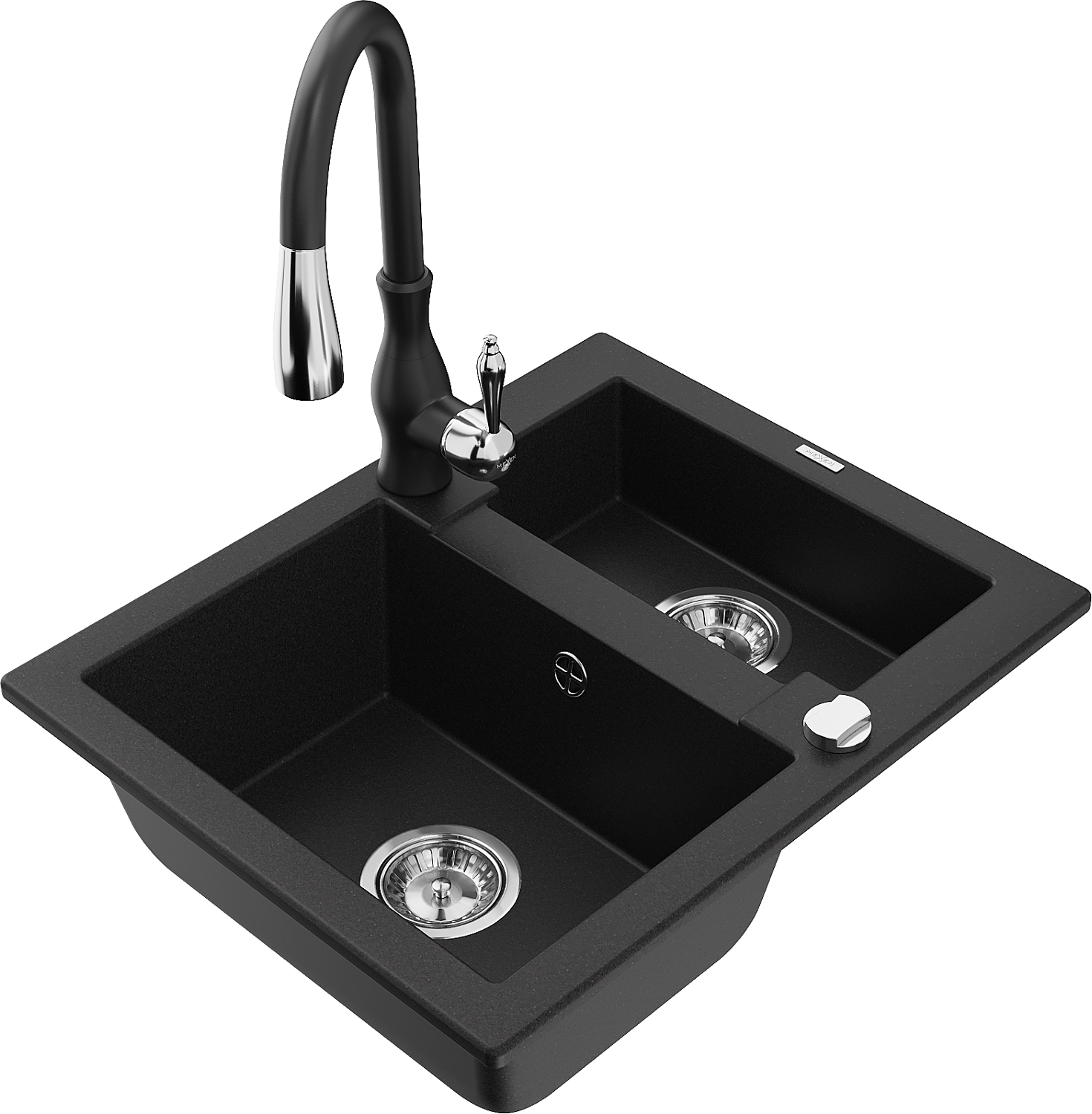 Mexen Carlos zlewozmywak granitowy 1,5-komorowy z baterią kuchenną Savita, czarny - 6518-77-672601-70