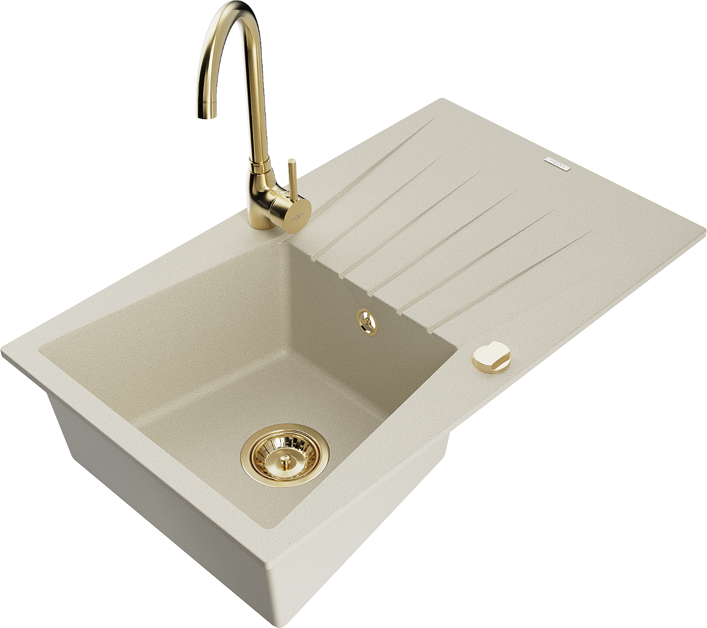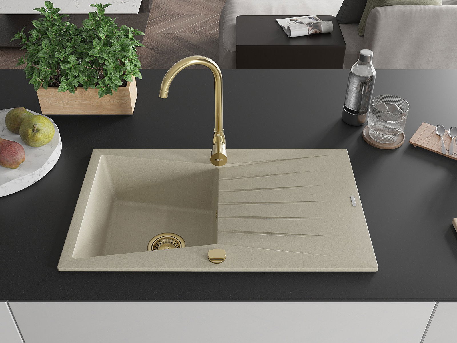 Mexen Cesar zlewozmywak granitowy 1-komorowy z ociekaczem i baterią kuchenną Telma, beżowy - 6514-69-670200-50