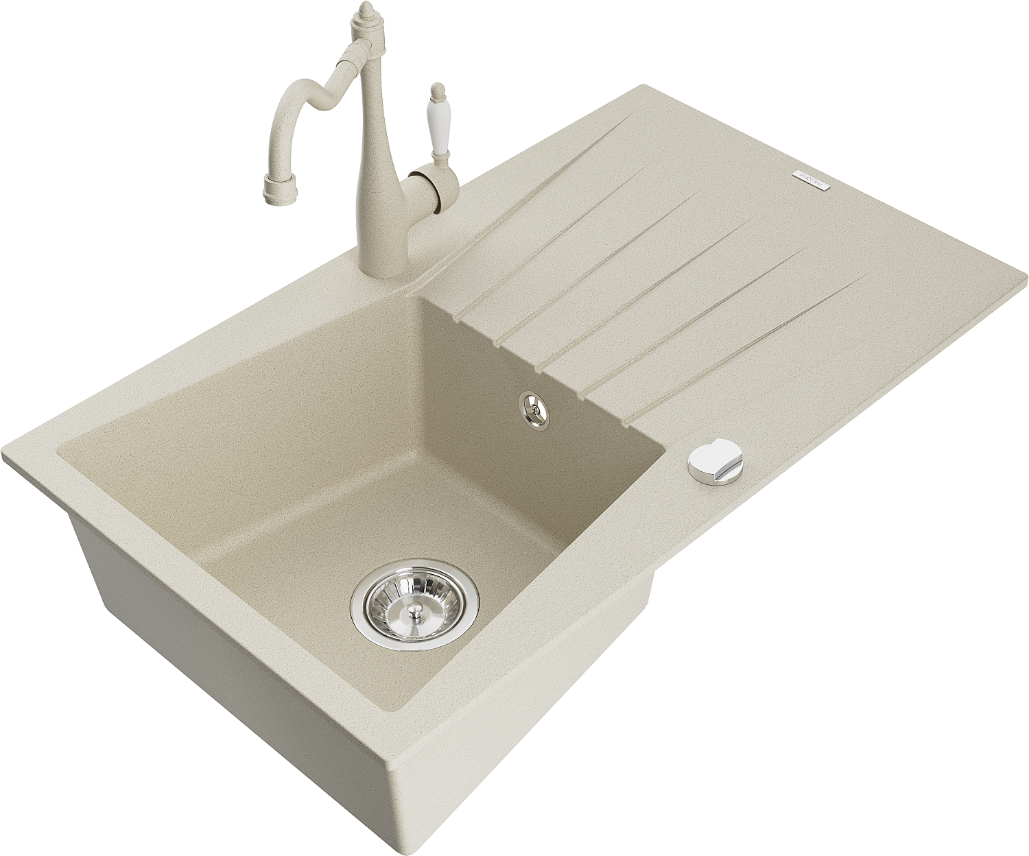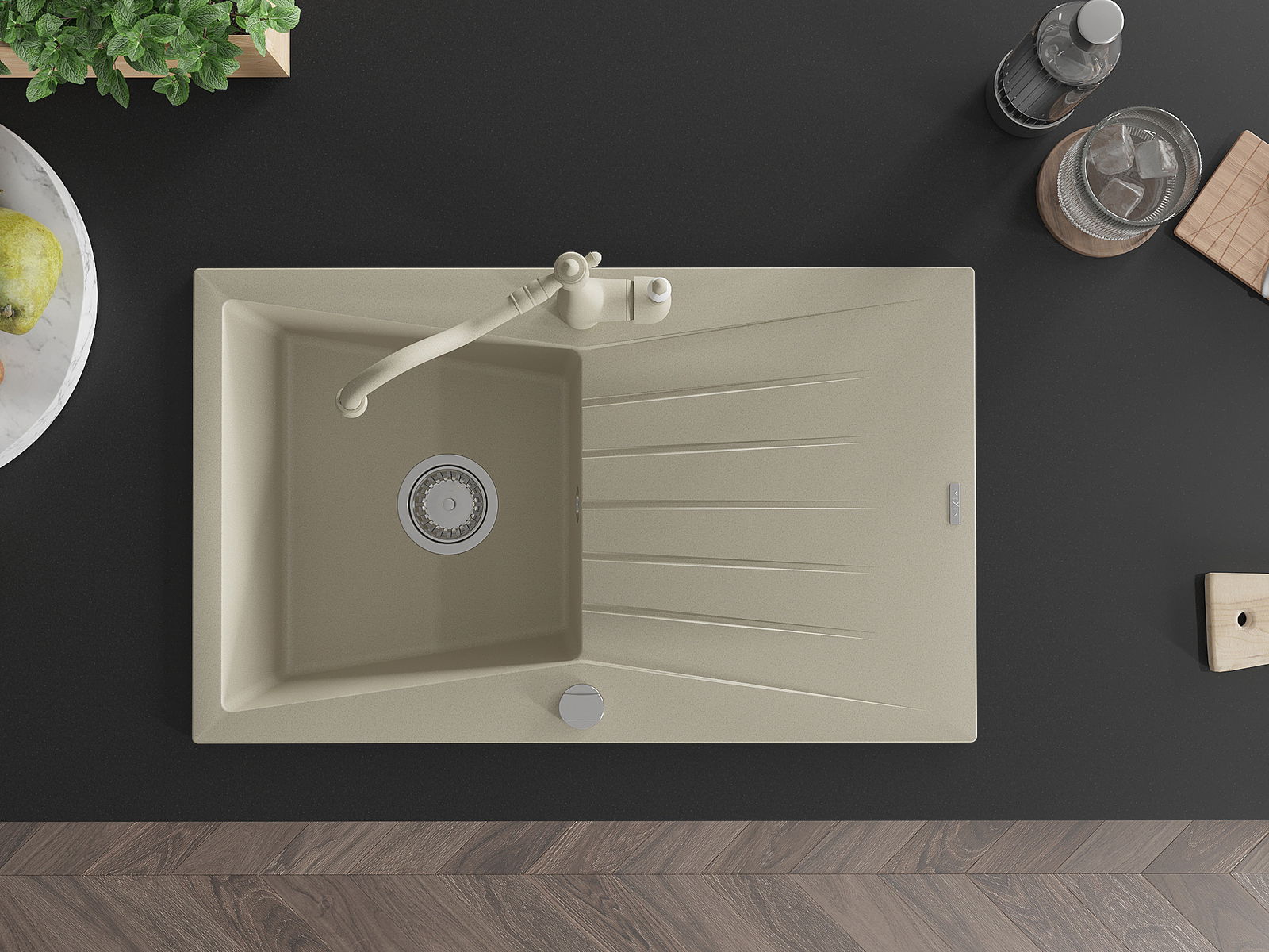 Mexen Cesar zlewozmywak granitowy 1-komorowy z ociekaczem i baterią kuchenną Carla, beżowy - 6514-69-670700-69