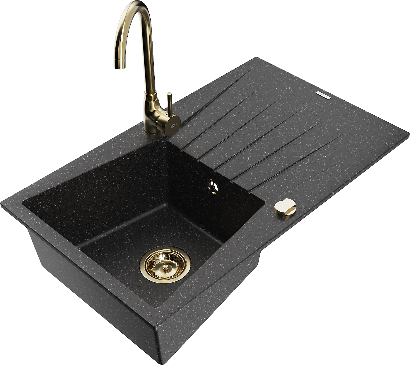 Mexen Cesar zlewozmywak granitowy 1-komorowy z ociekaczem i baterią kuchenną Telma, czarny/srebrny - 6514-73-670200-50