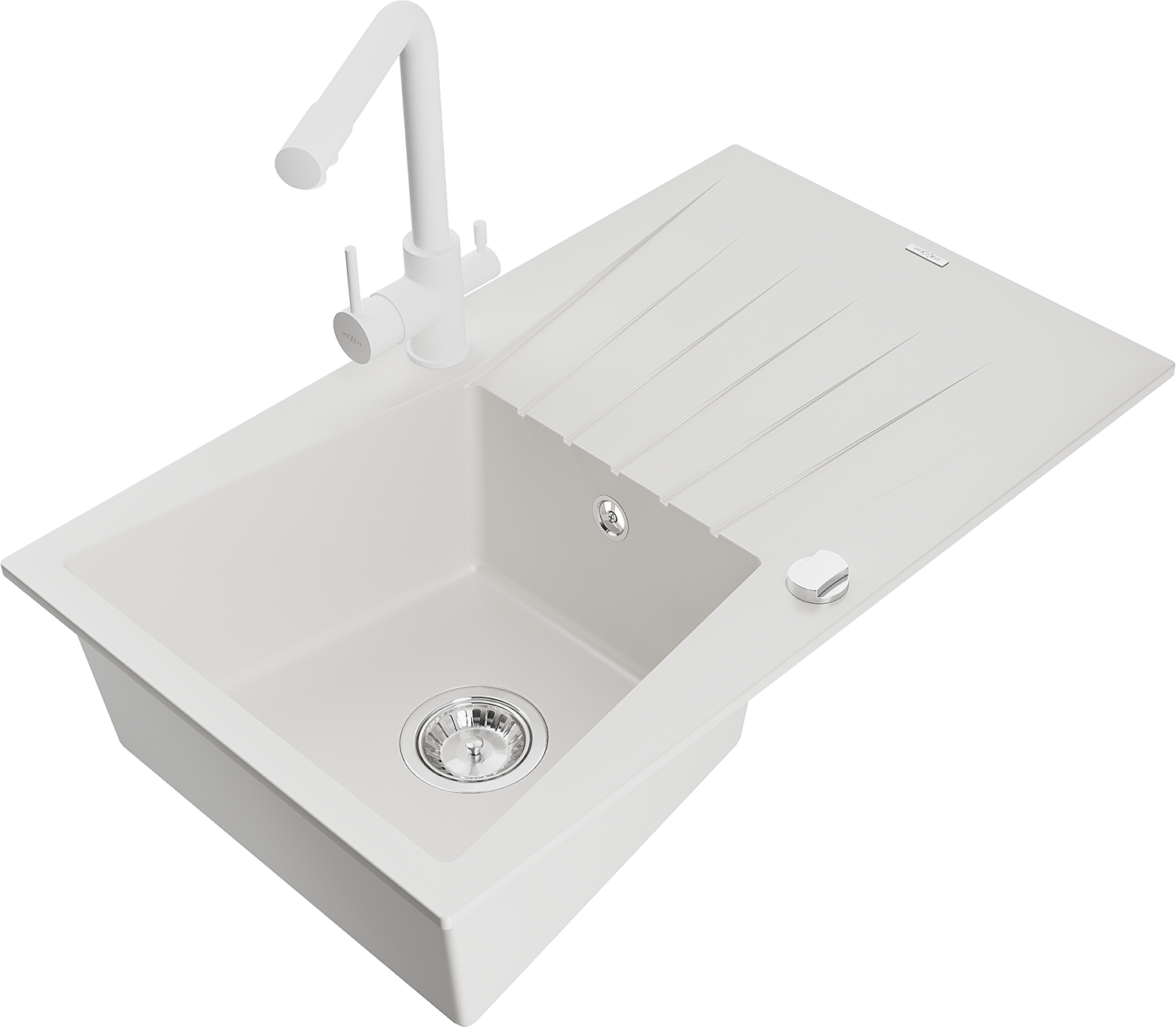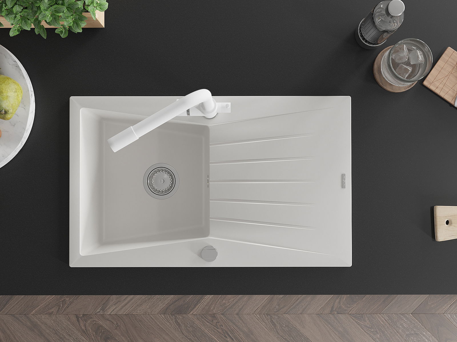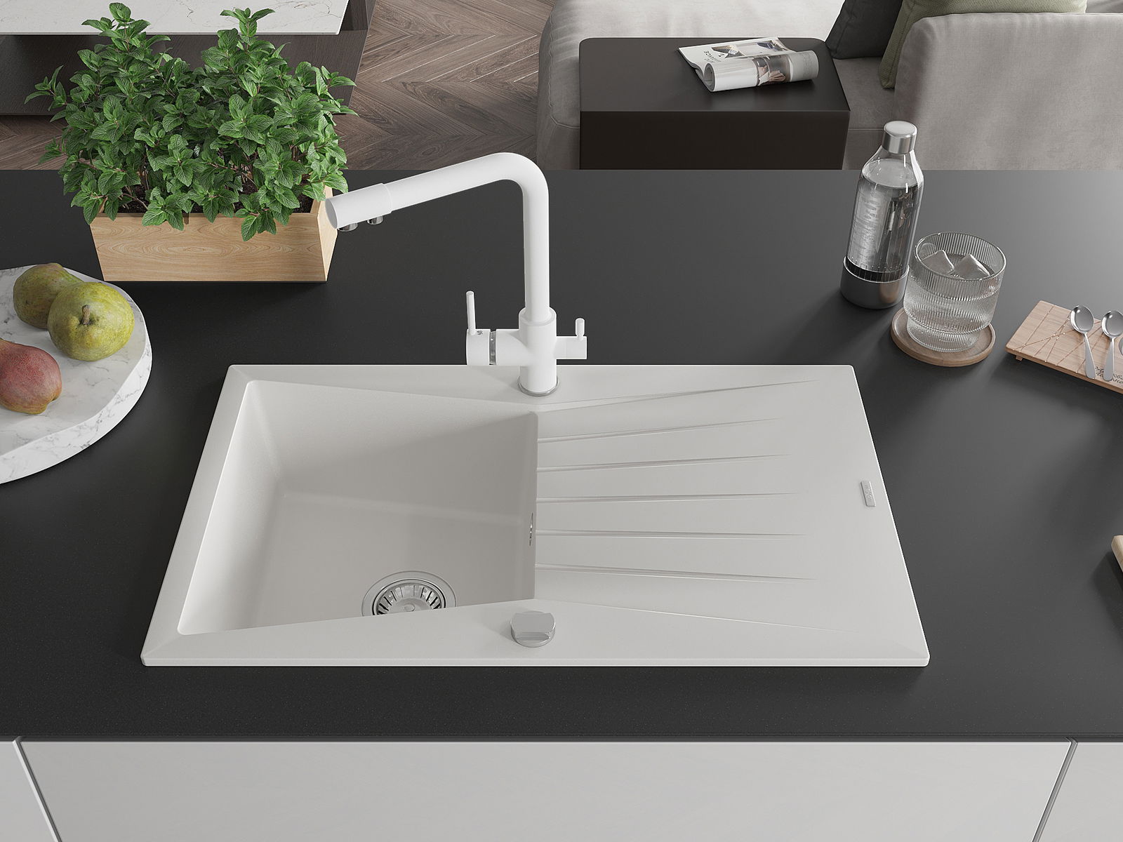 Mexen Cesar zlewozmywak granitowy 1-komorowy z ociekaczem i baterią kuchenną Duero, biały - 6514-20-671600-20