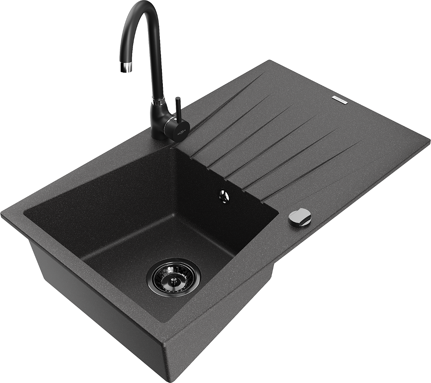 Mexen Cesar zlewozmywak granitowy 1-komorowy z ociekaczem i baterią kuchenną Telma, czarny nakrapiany - 6514-76-670200-70-B
