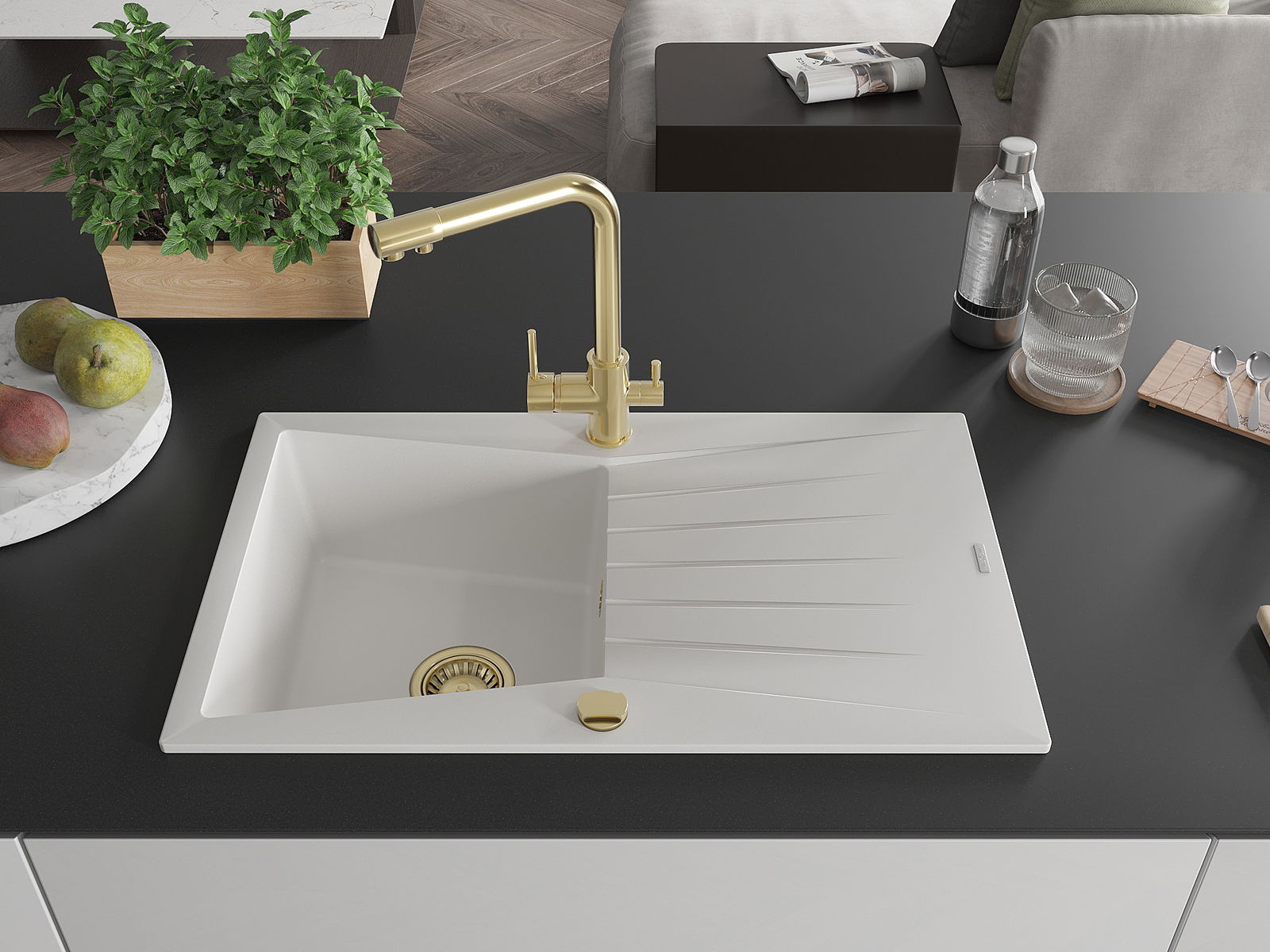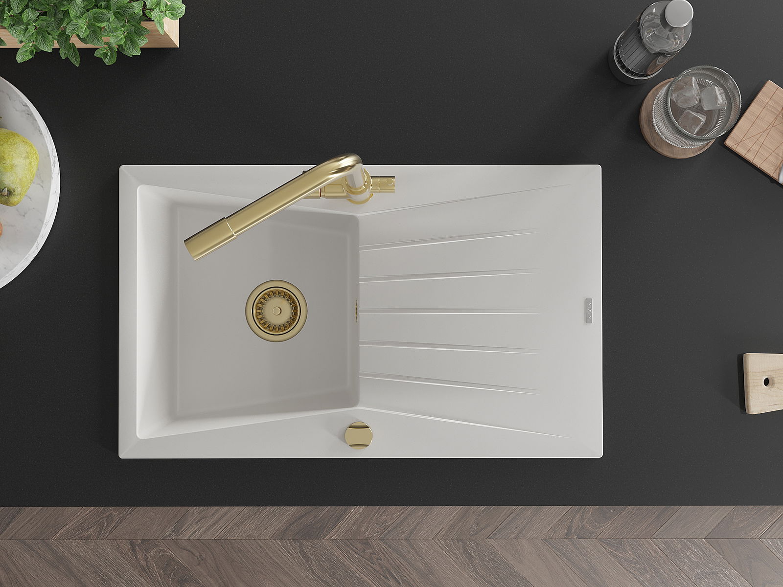Mexen Cesar zlewozmywak granitowy 1-komorowy z ociekaczem i baterią kuchenną Duero, biały - 6514-20-671600-50