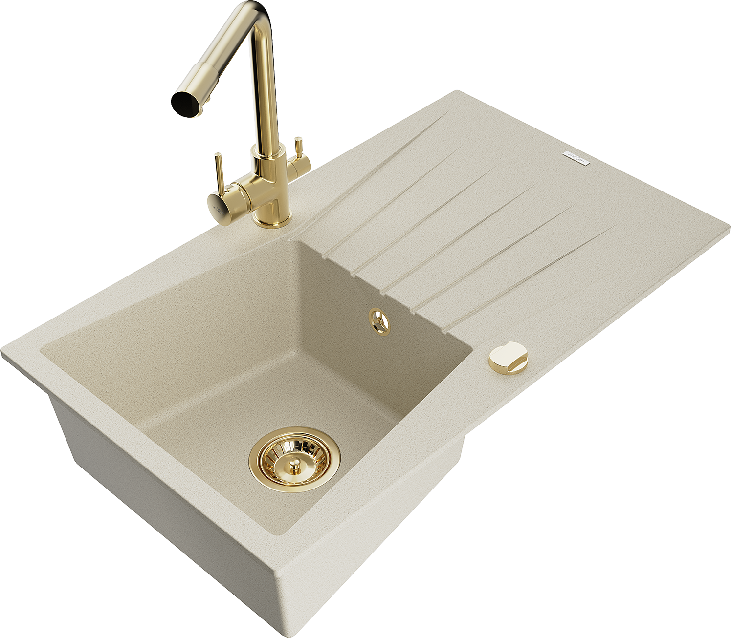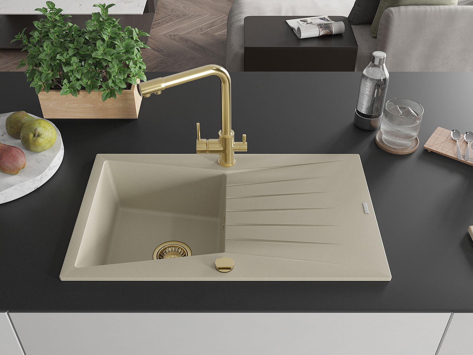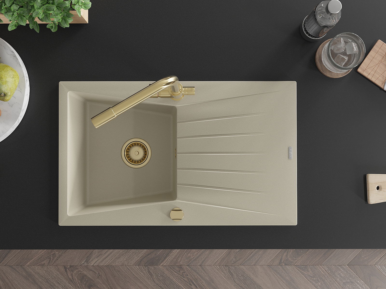 Mexen Cesar zlewozmywak granitowy 1-komorowy z ociekaczem i baterią kuchenną Duero, beżowy - 6514-69-671600-50