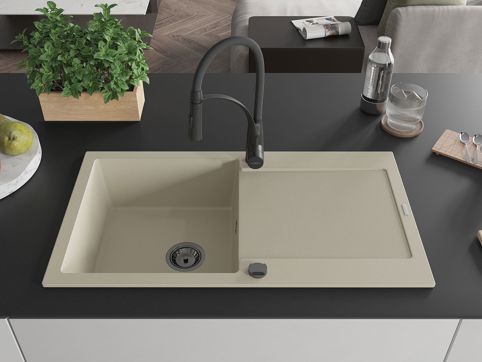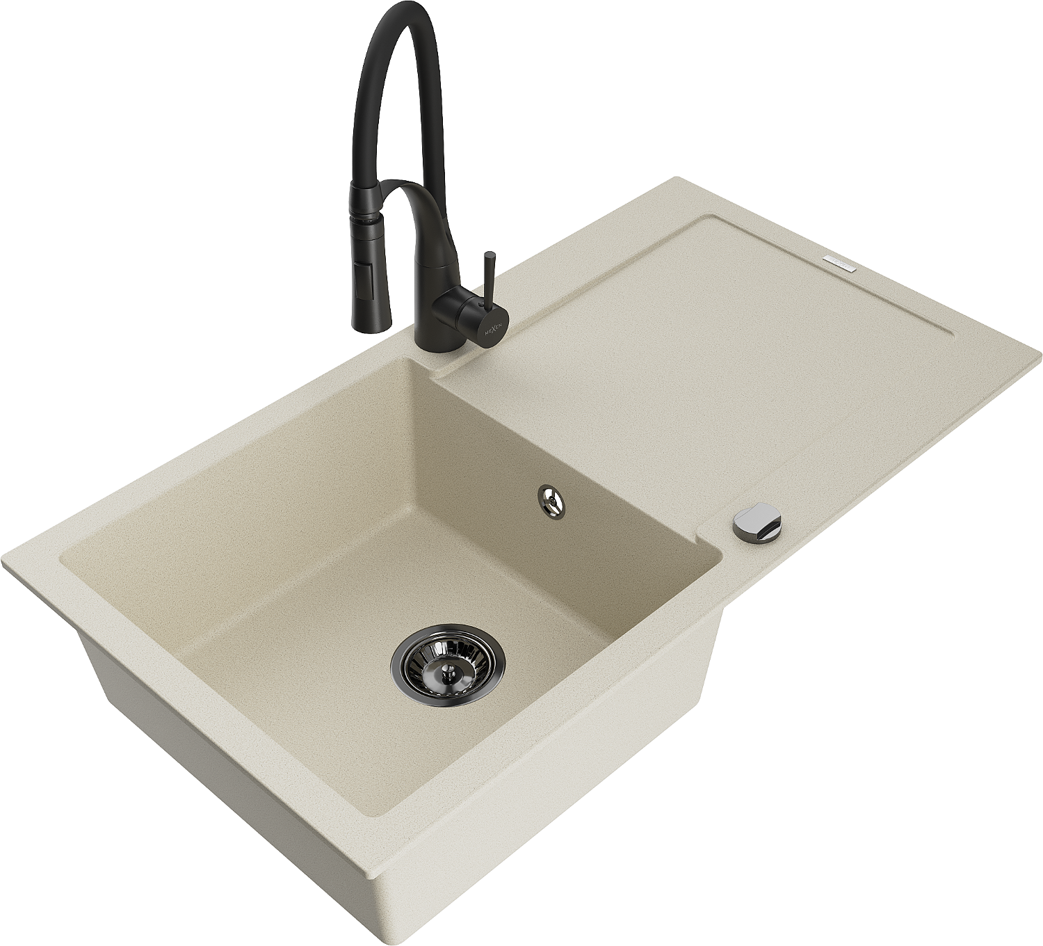 Mexen Leo zlewozmywak granitowy 1-komorowy z ociekaczem i baterią kuchenną Aster, beżowy - 6501-69-73450-70-B