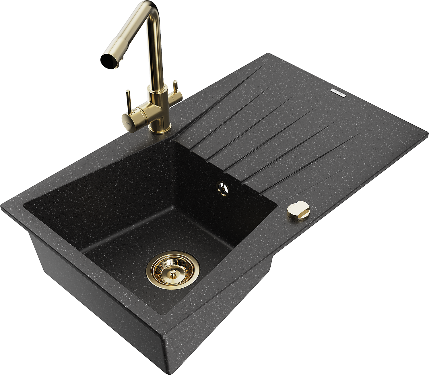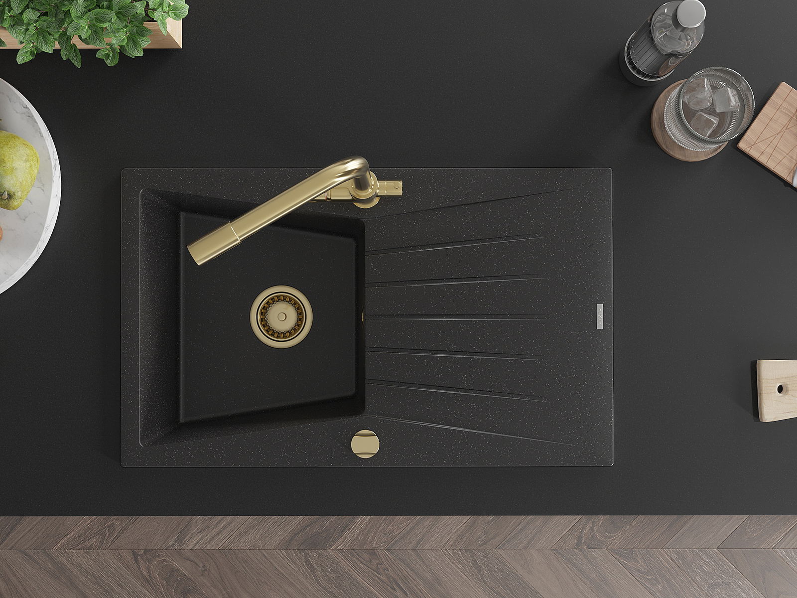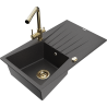 Mexen Cesar zlewozmywak granitowy 1-komorowy z ociekaczem i baterią kuchenną Duero, czarny/srebrny metalik - 6514-73-671600-50