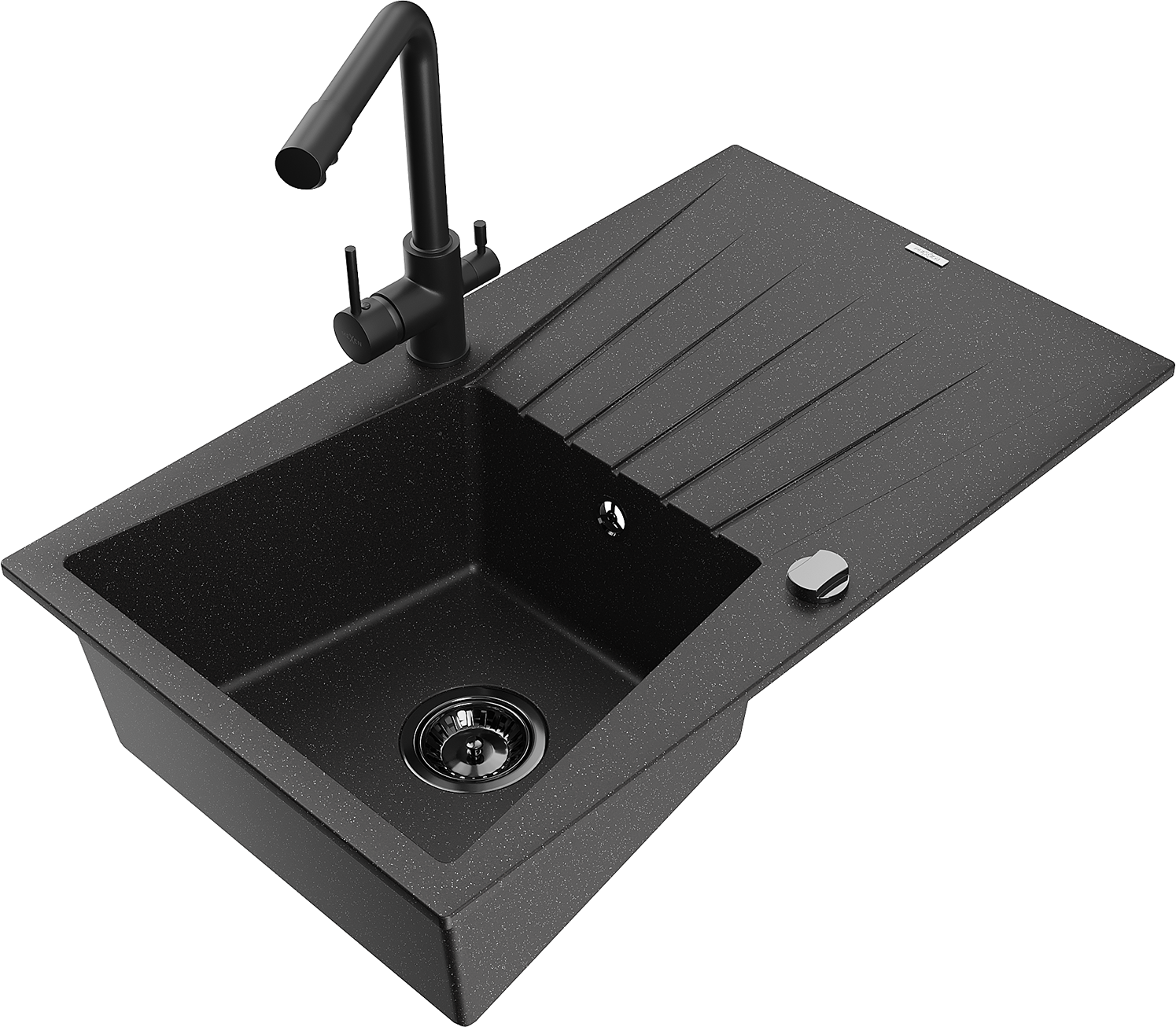 Mexen Cesar zlewozmywak granitowy 1-komorowy z ociekaczem i baterią kuchenną Duero, czarny/srebrny metalik - 6514-73-671600-70-B