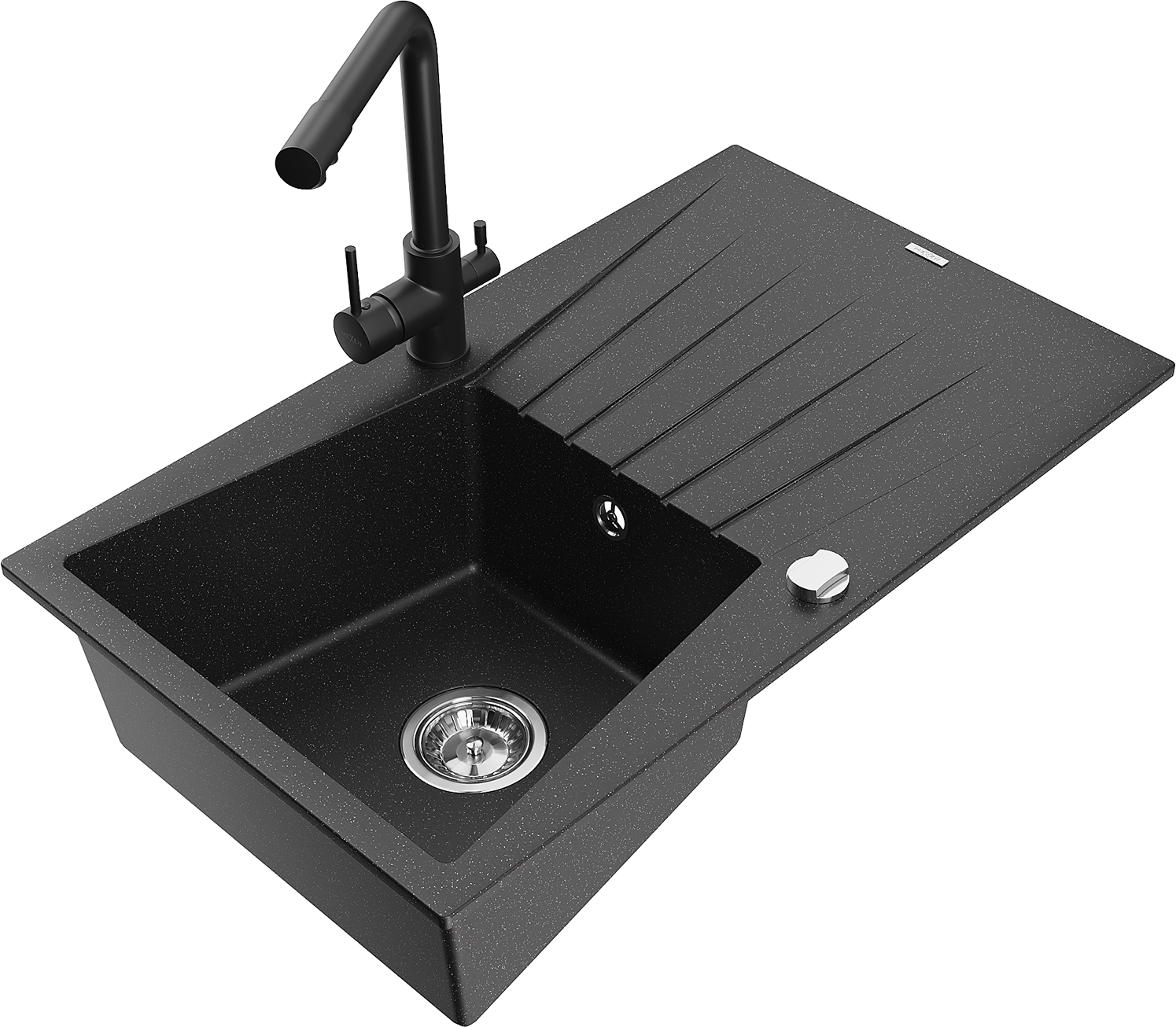 Mexen Cesar zlewozmywak granitowy 1-komorowy z ociekaczem i baterią kuchenną Duero, czarny/srebrny metalik - 6514-73-671600-70