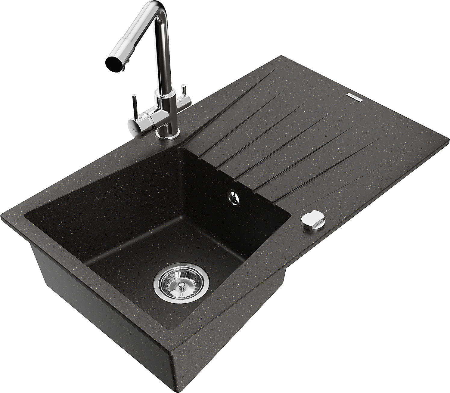Mexen Cesar zlewozmywak granitowy 1-komorowy z ociekaczem i baterią kuchenną Duero, czarny/złoty metalik - 6514-75-671600-00
