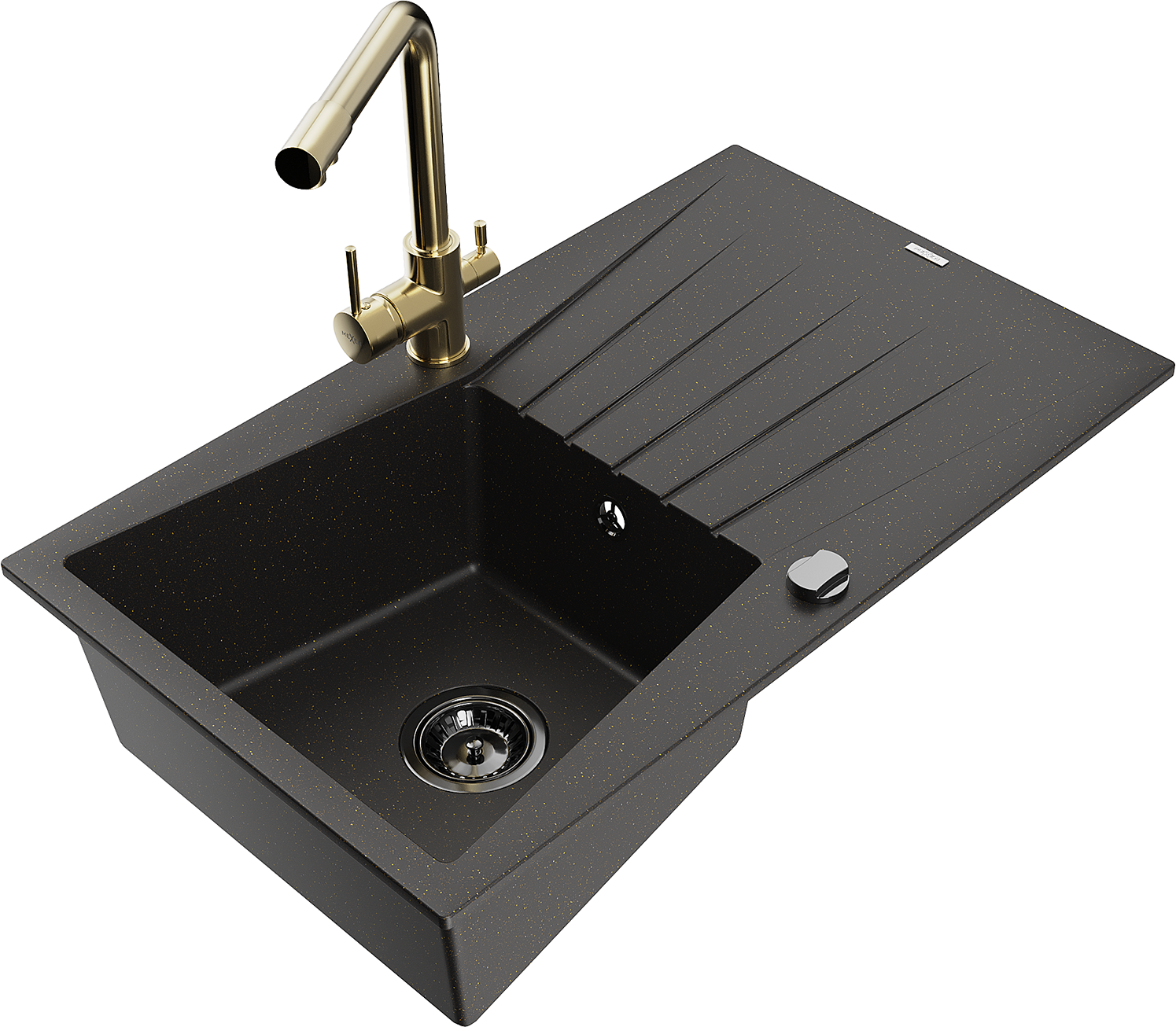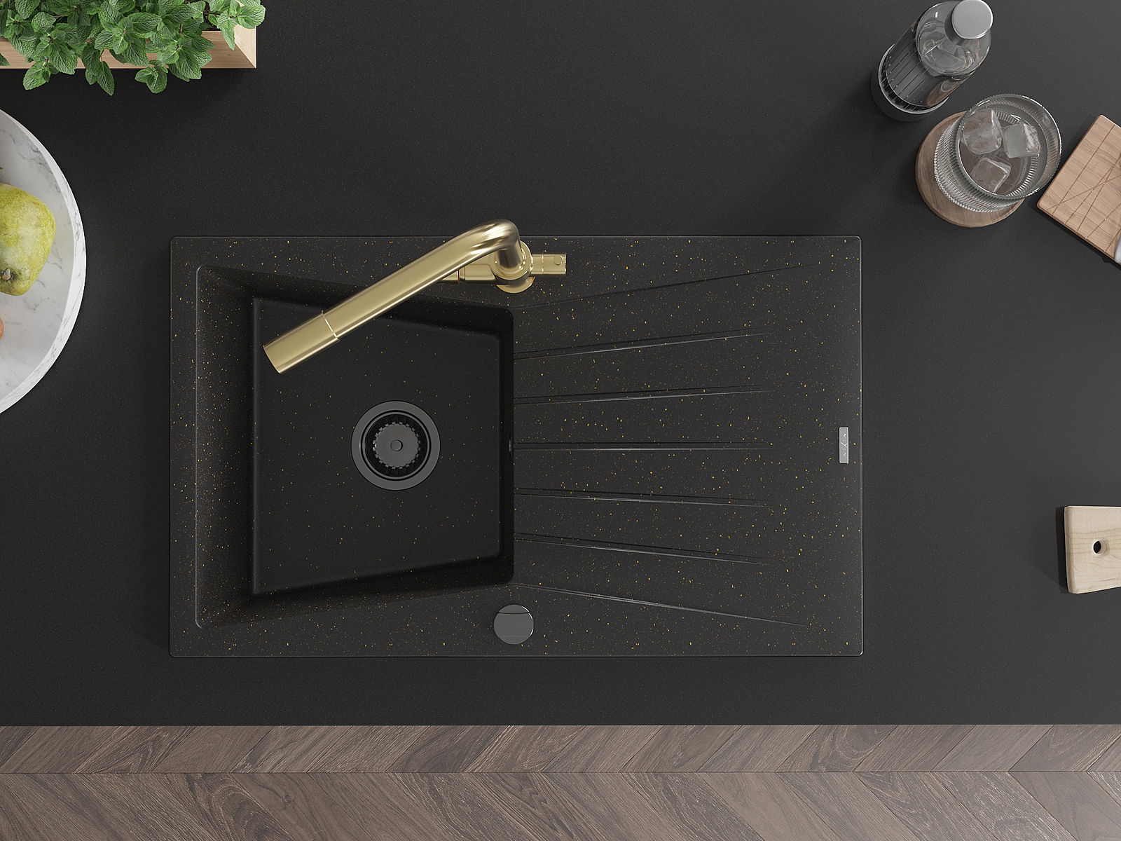 Mexen Cesar zlewozmywak granitowy 1-komorowy z ociekaczem i baterią kuchenną Duero, czarny/złoty metalik - 6514-75-671600-50-B
