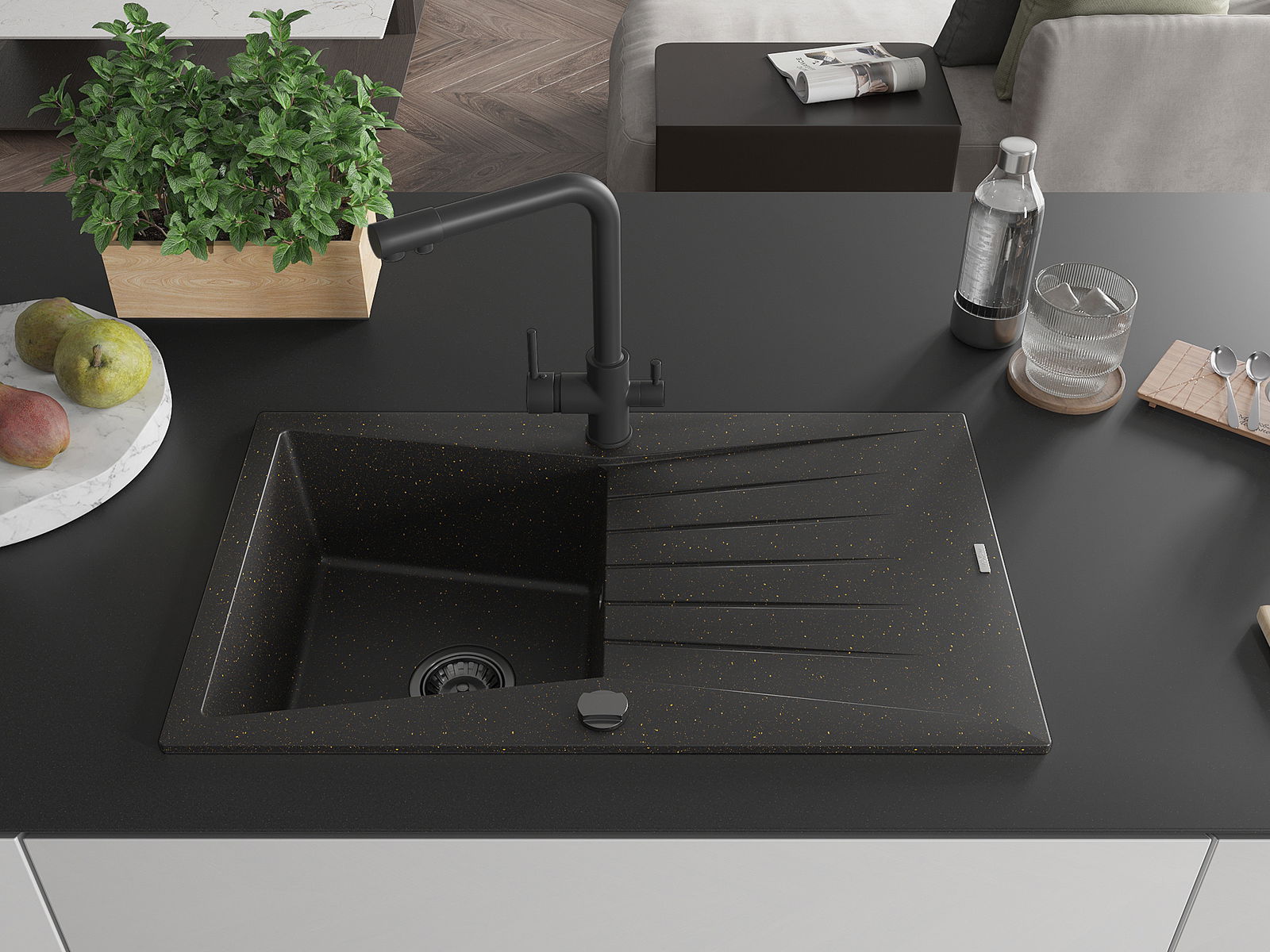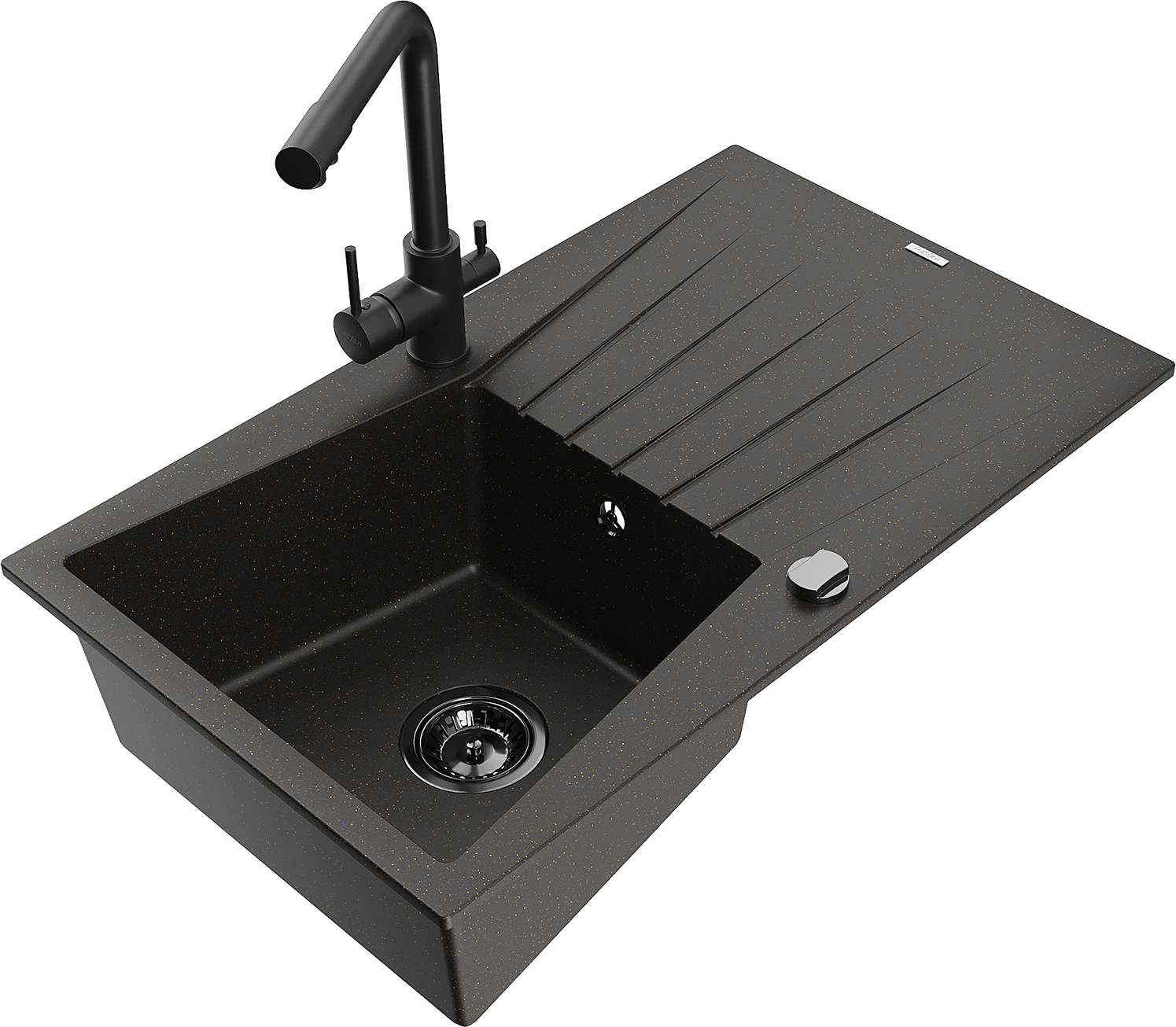 Mexen Cesar zlewozmywak granitowy 1-komorowy z ociekaczem i baterią kuchenną Duero, czarny/złoty metalik - 6514-75-671600-70-B