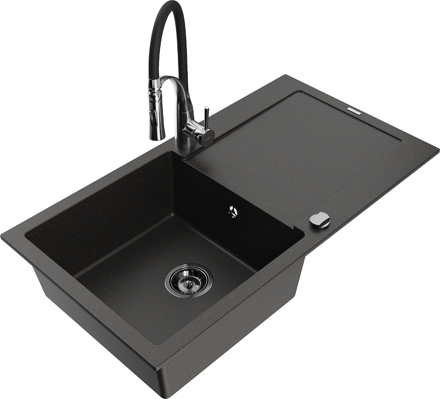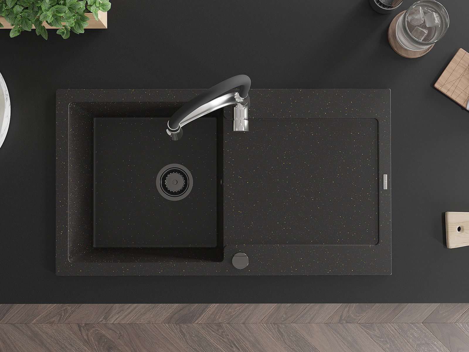 Mexen Leo zlewozmywak granitowy 1-komorowy z ociekaczem i baterią kuchenną Aster, czarny/złoty metalik - 6501-75-73450-07-B