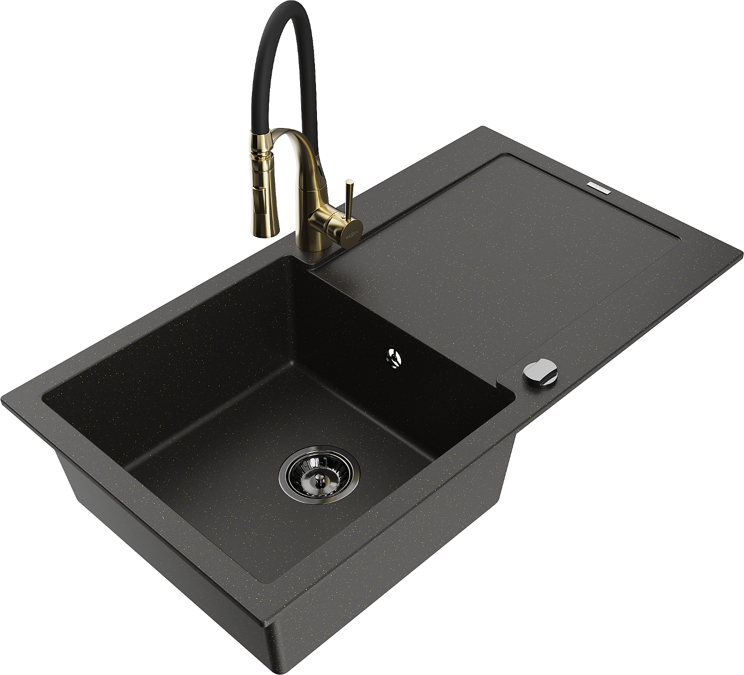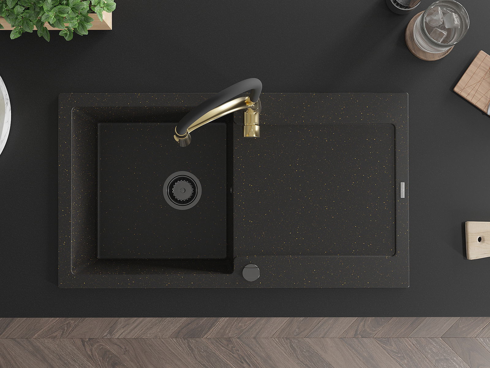 Mexen Leo zlewozmywak granitowy 1-komorowy z ociekaczem i baterią kuchenną Aster, czarny/złoty metalik - 6501-75-73450-57-B
