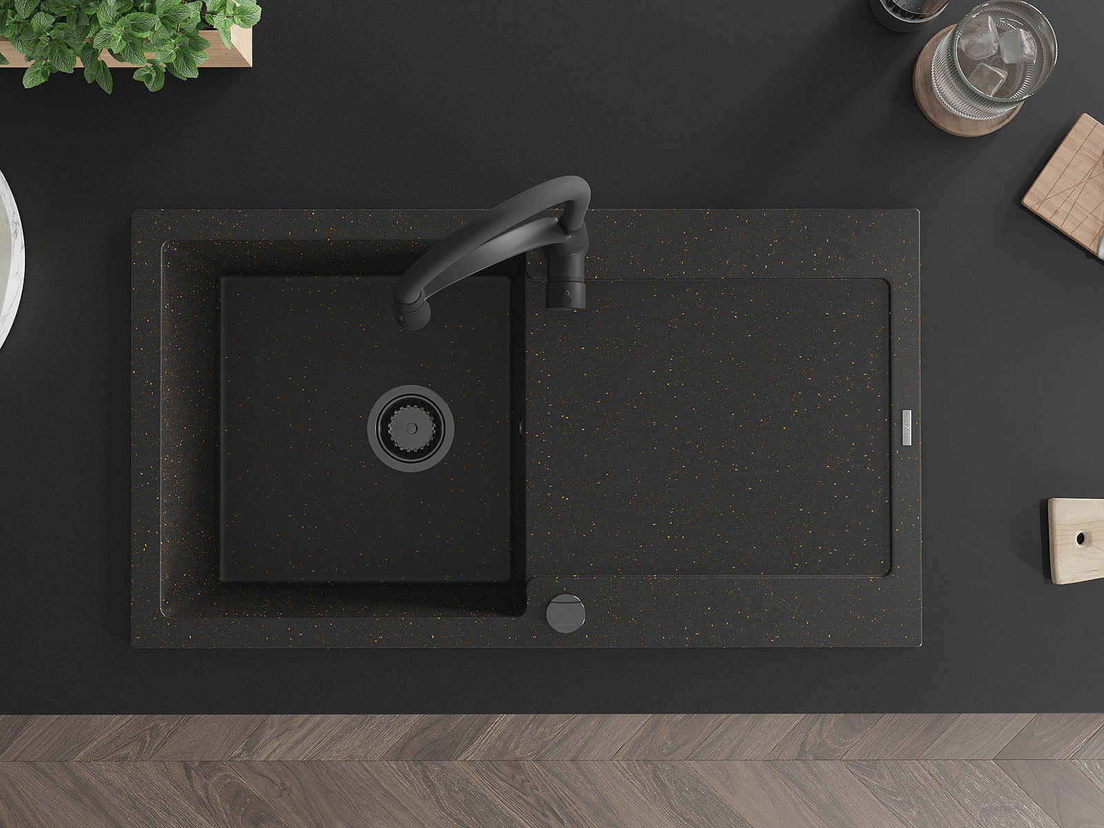 Mexen Leo zlewozmywak granitowy 1-komorowy z ociekaczem i baterią kuchenną Aster, czarny/złoty metalik - 6501-75-73450-70-B
