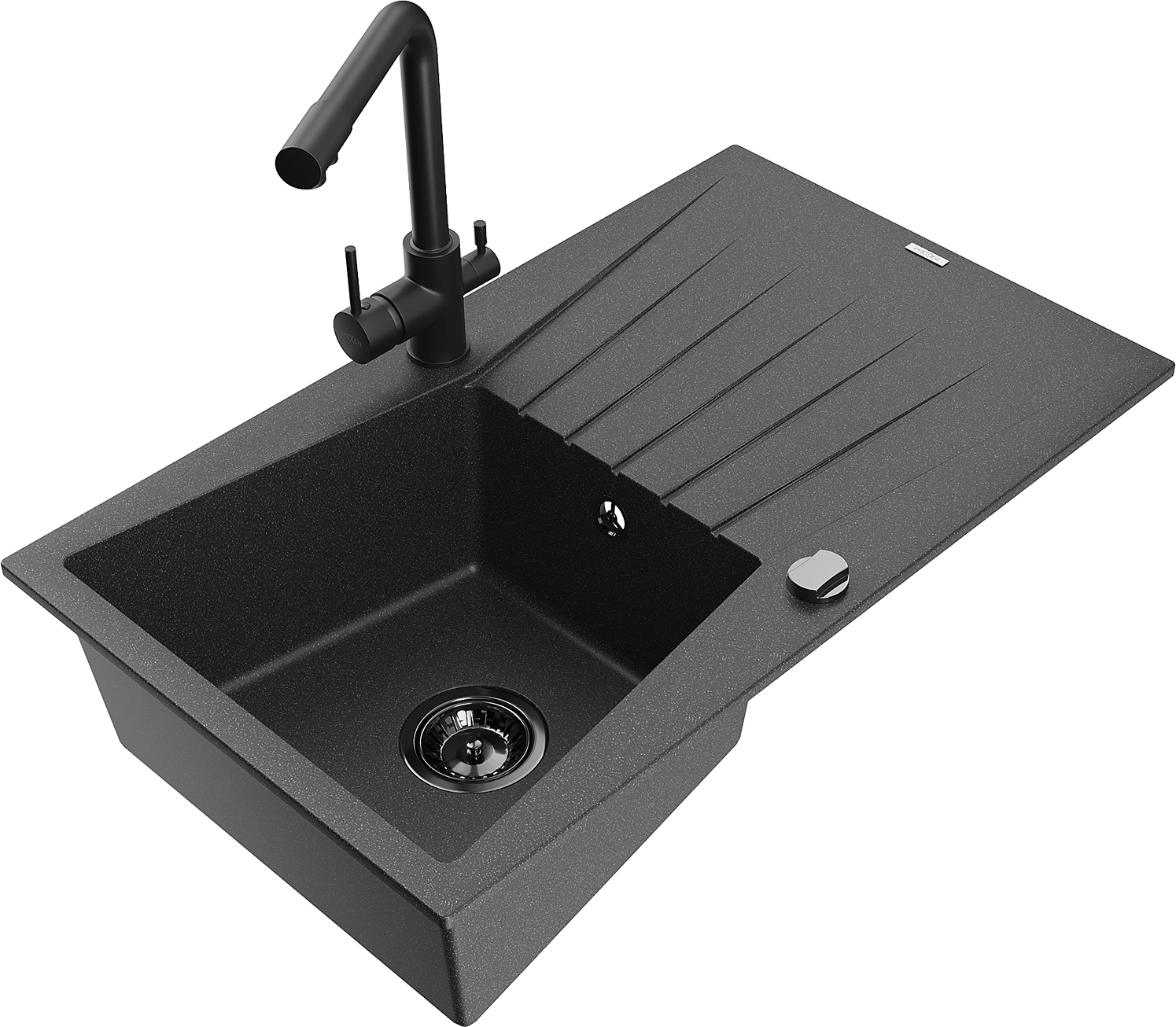 Mexen Cesar zlewozmywak granitowy 1-komorowy z ociekaczem i baterią kuchenną Duero, czarny nakrapiany - 6514-76-671600-70-B