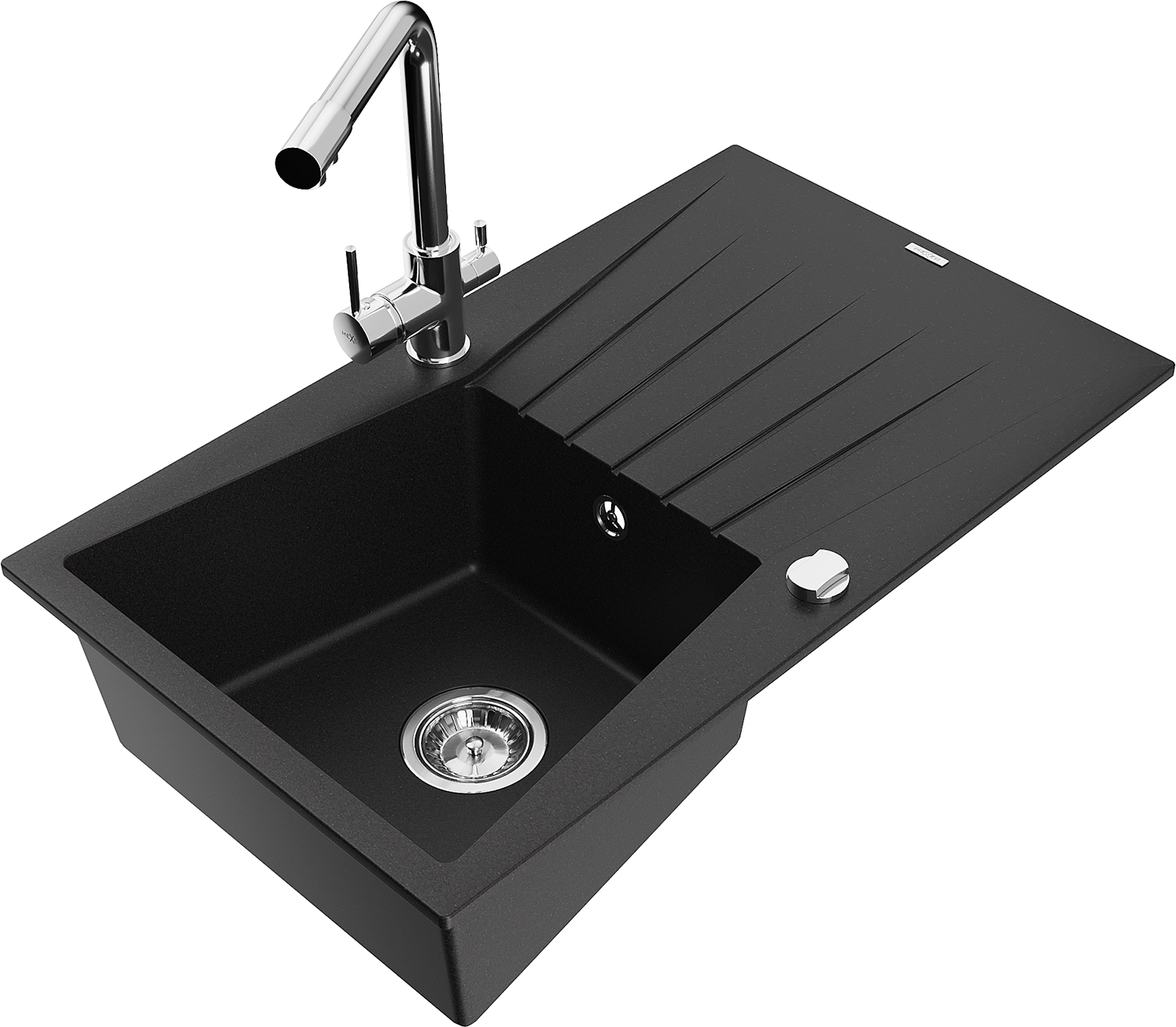 Mexen Cesar zlewozmywak granitowy 1-komorowy z ociekaczem i baterią kuchenną Duero, czarny - 6514-77-671600-00