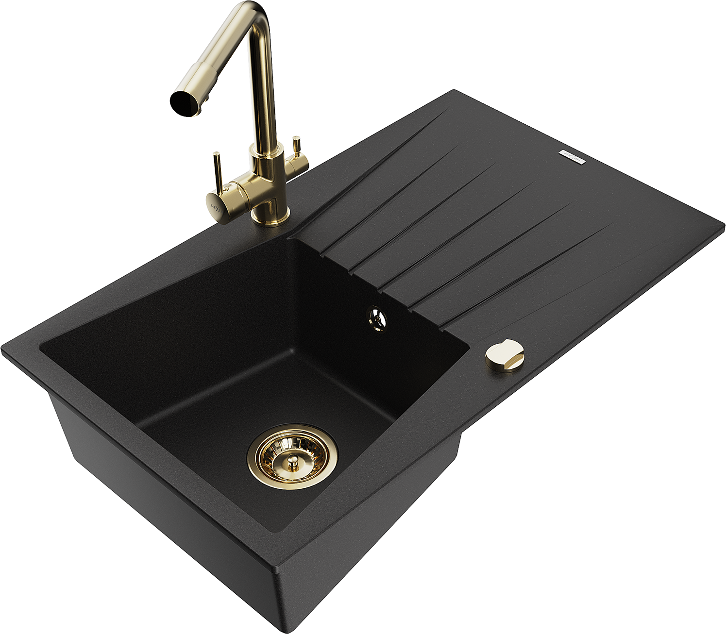 Mexen Cesar zlewozmywak granitowy 1-komorowy z ociekaczem i baterią kuchenną Duero, czarny - 6514-77-671600-50
