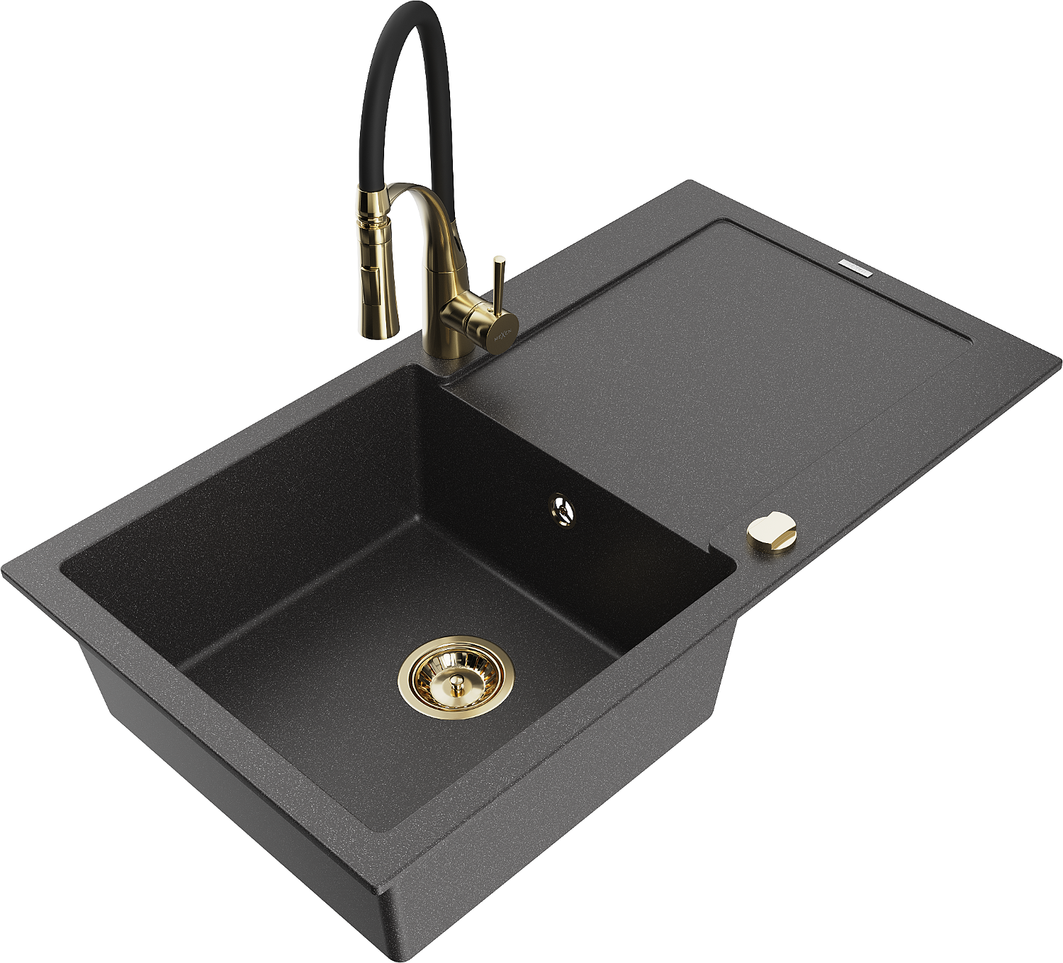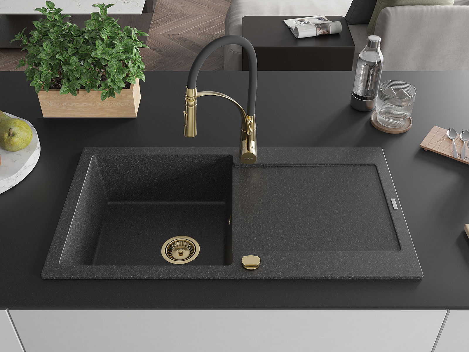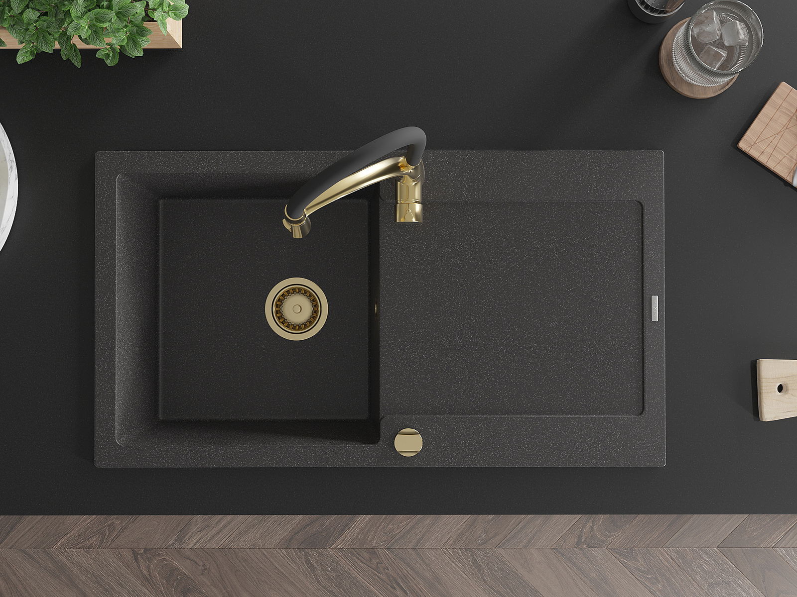 Mexen Leo zlewozmywak granitowy 1-komorowy z ociekaczem i baterią kuchenną Aster, czarny nakrapiany - 6501-76-73450-57-G