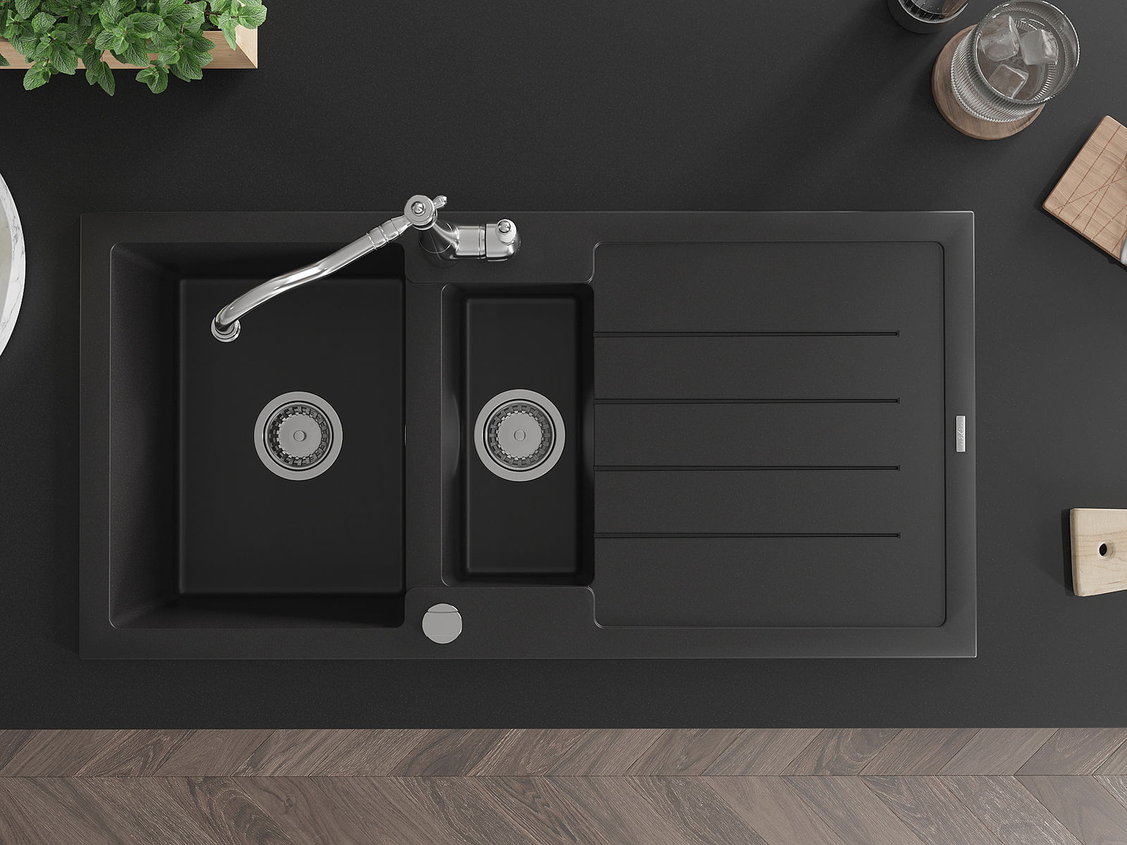 Dzięki zastosowaniu uniwersalnego systemu mocowania, zlew jest odwracalny, a ociekacz może zostać zamontowany na blacie po lewej lub prawej stronie. W ten sposób możesz z łatwością dopasować stronę do swoich potrzeb i warunków.