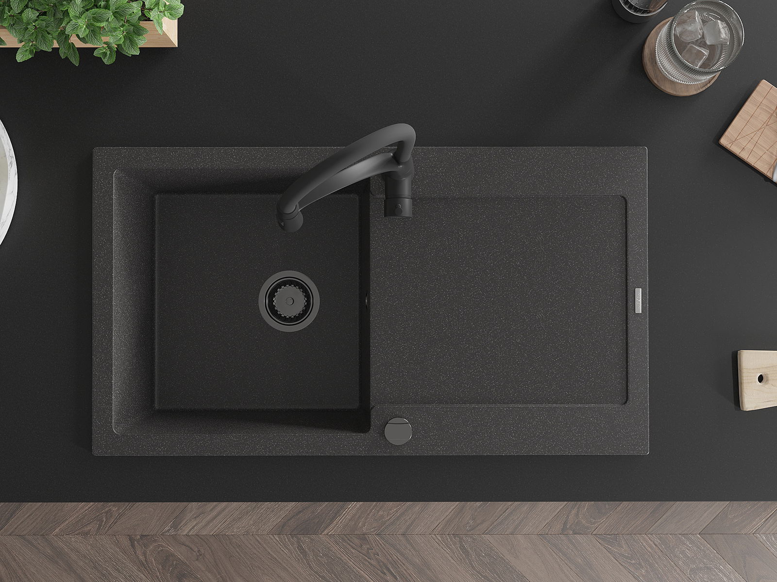 Mexen Leo zlewozmywak granitowy 1-komorowy z ociekaczem i baterią kuchenną Aster, czarny nakrapiany - 6501-76-73450-70-B