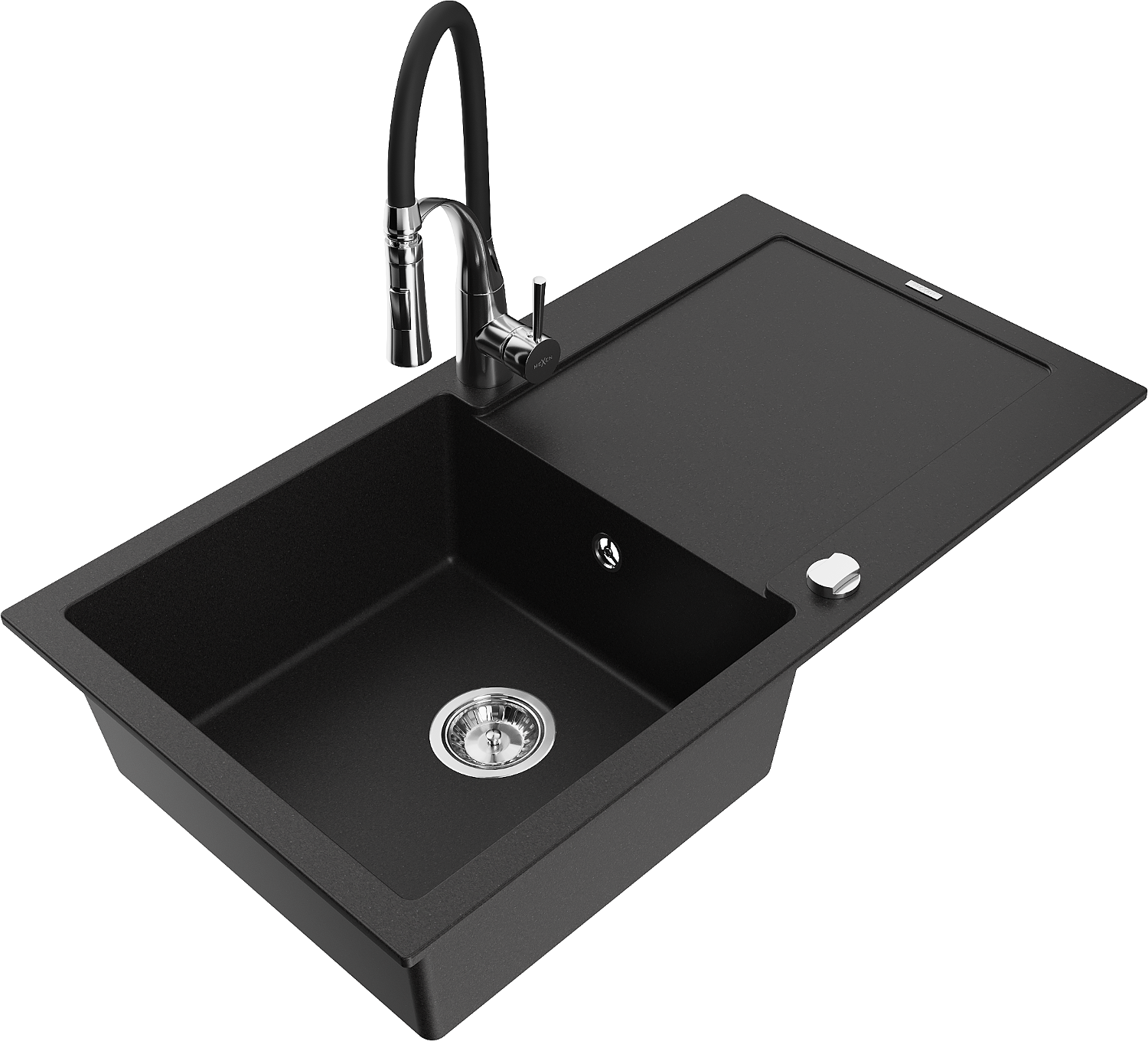 Mexen Leo zlewozmywak granitowy 1-komorowy z ociekaczem i baterią kuchenną Aster, czarny - 6501-77-73450-07