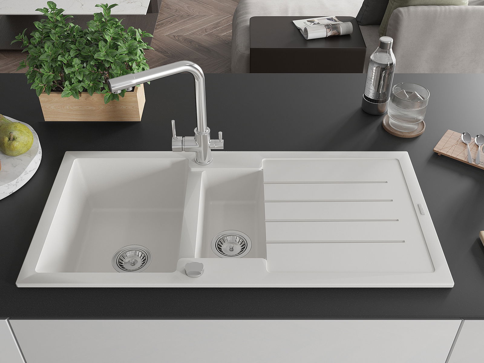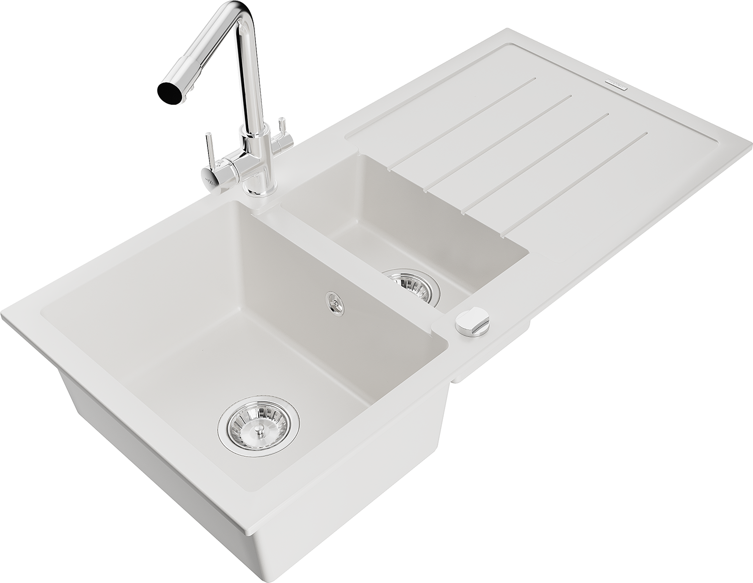 Mexen Andres zlewozmywak granitowy 1,5-komorowy z ociekaczem i baterią kuchenną Duero, biały - 6515-20-671600-00