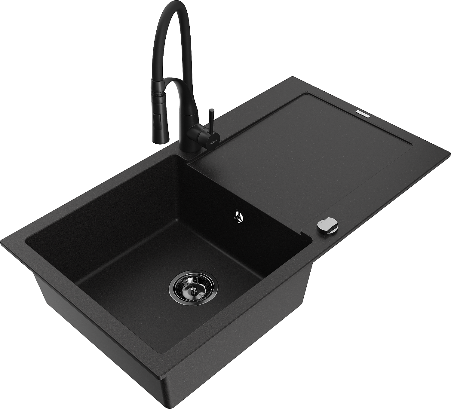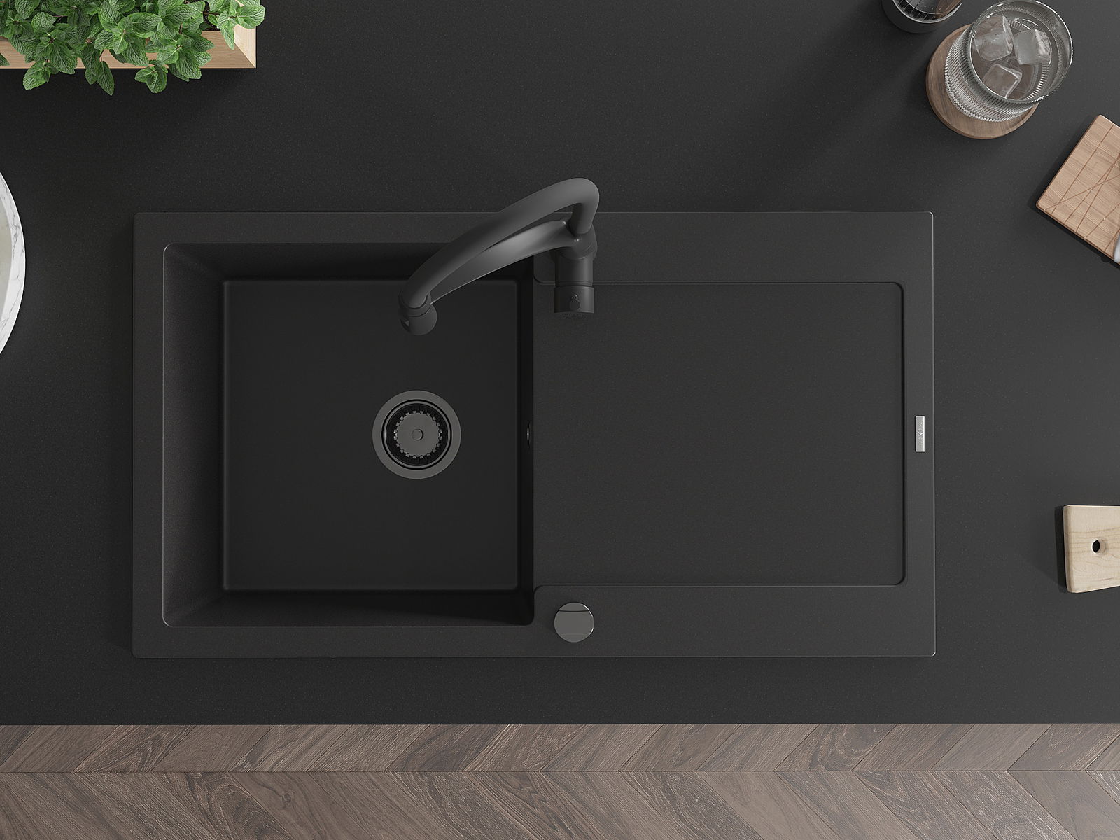 Mexen Leo zlewozmywak granitowy 1-komorowy z ociekaczem i baterią kuchenną Aster, czarny - 6501-77-73450-70-B
