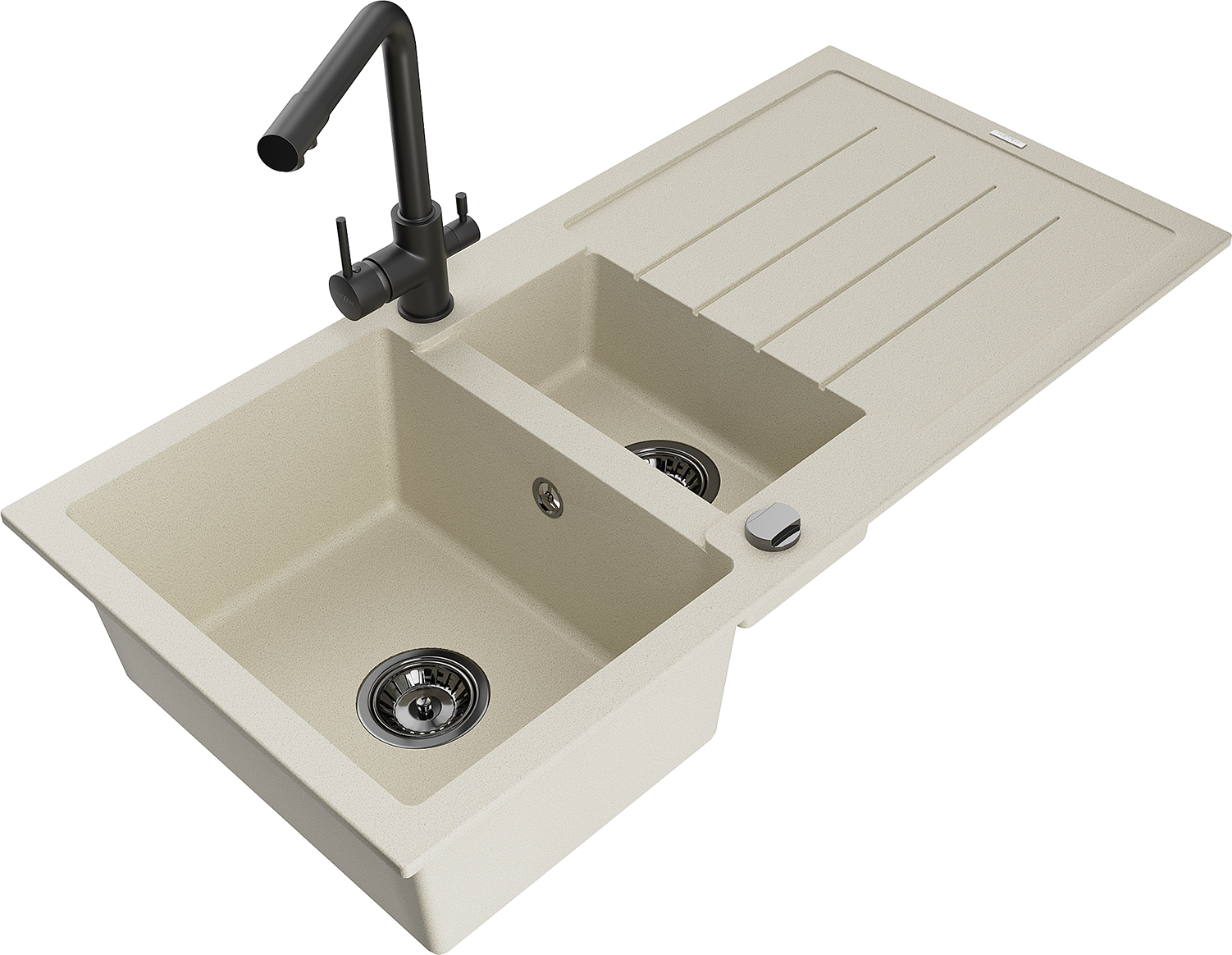 Mexen Andres zlewozmywak granitowy 1,5-komorowy z ociekaczem i baterią kuchenną Duero, beżowy - 6515-69-671600-70