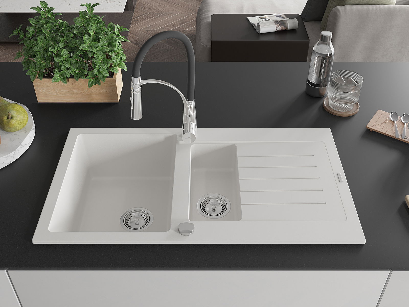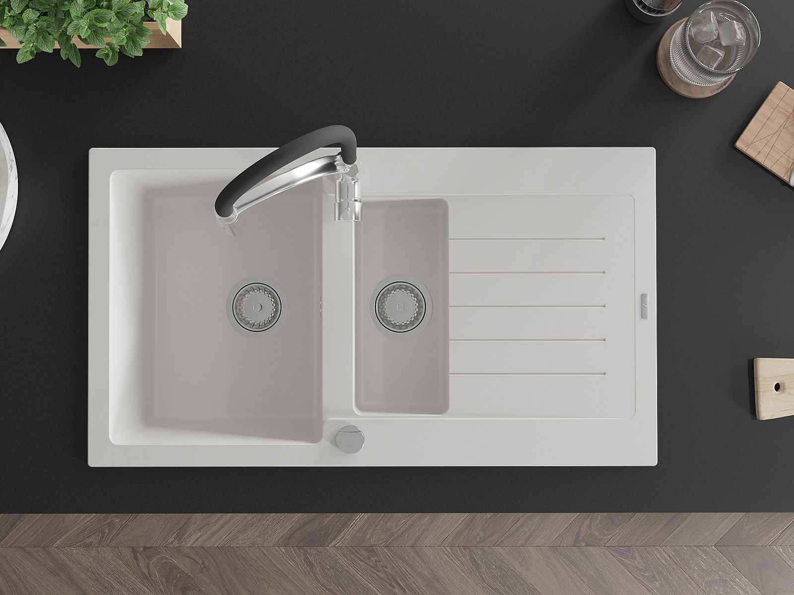 Mexen Matias zlewozmywak granitowy 1,5-komorowy z ociekaczem i baterią kuchenną Aster, biały - 6502-20-73450-07