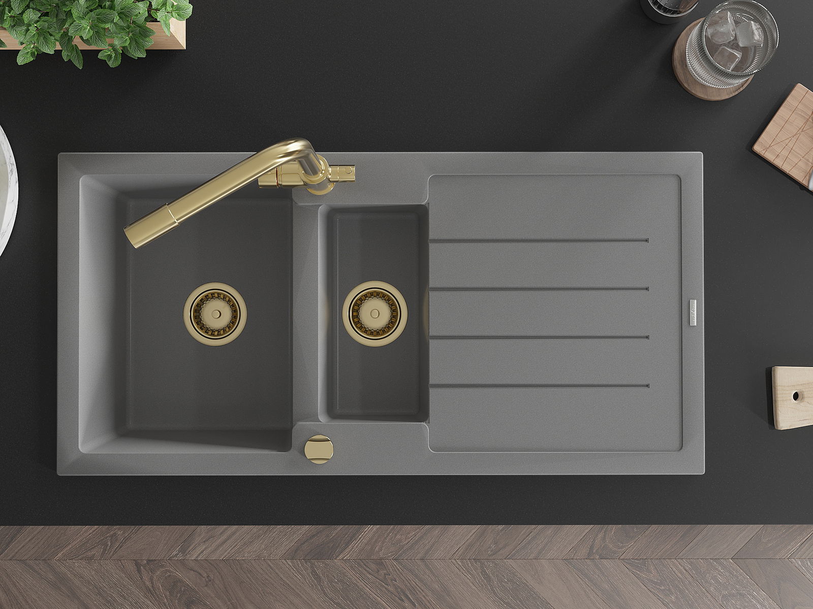 Zlew posiada 2 podfrezowane otwory o średnicy 35 mm, do samodzielnego wybicia. Można je wykorzystać m.in. do montażu dozownika na płyn, który wyeliminuje obecność plastikowych butelek w kuchni i nada jej eleganckiego wykończenia.